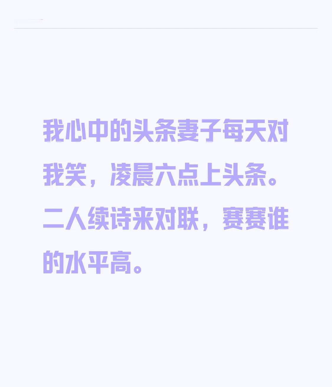 我心中的头条 妻子每天对我笑, 凌晨六点上头条。 二人续诗来对联, 赛赛谁的水平高。