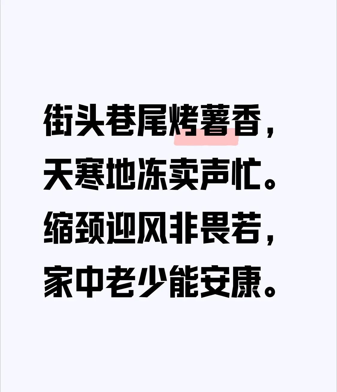 街头巷尾烤薯香, 天寒地冻卖声忙。 缩颈迎风非畏若, 家中老少能安康。