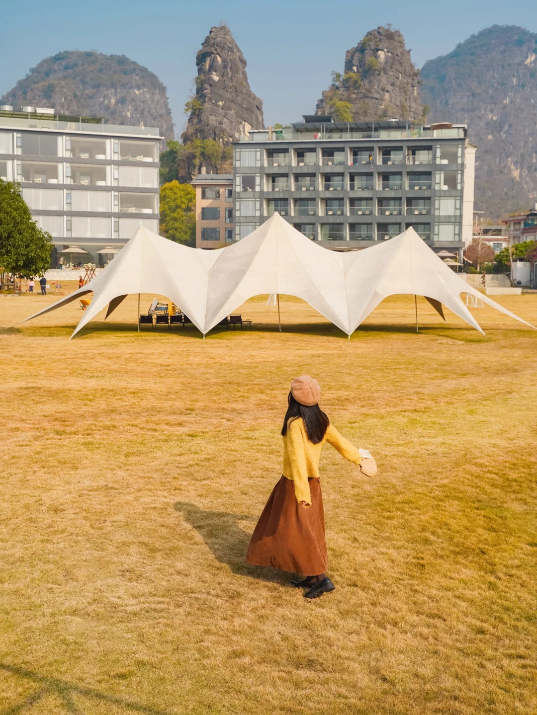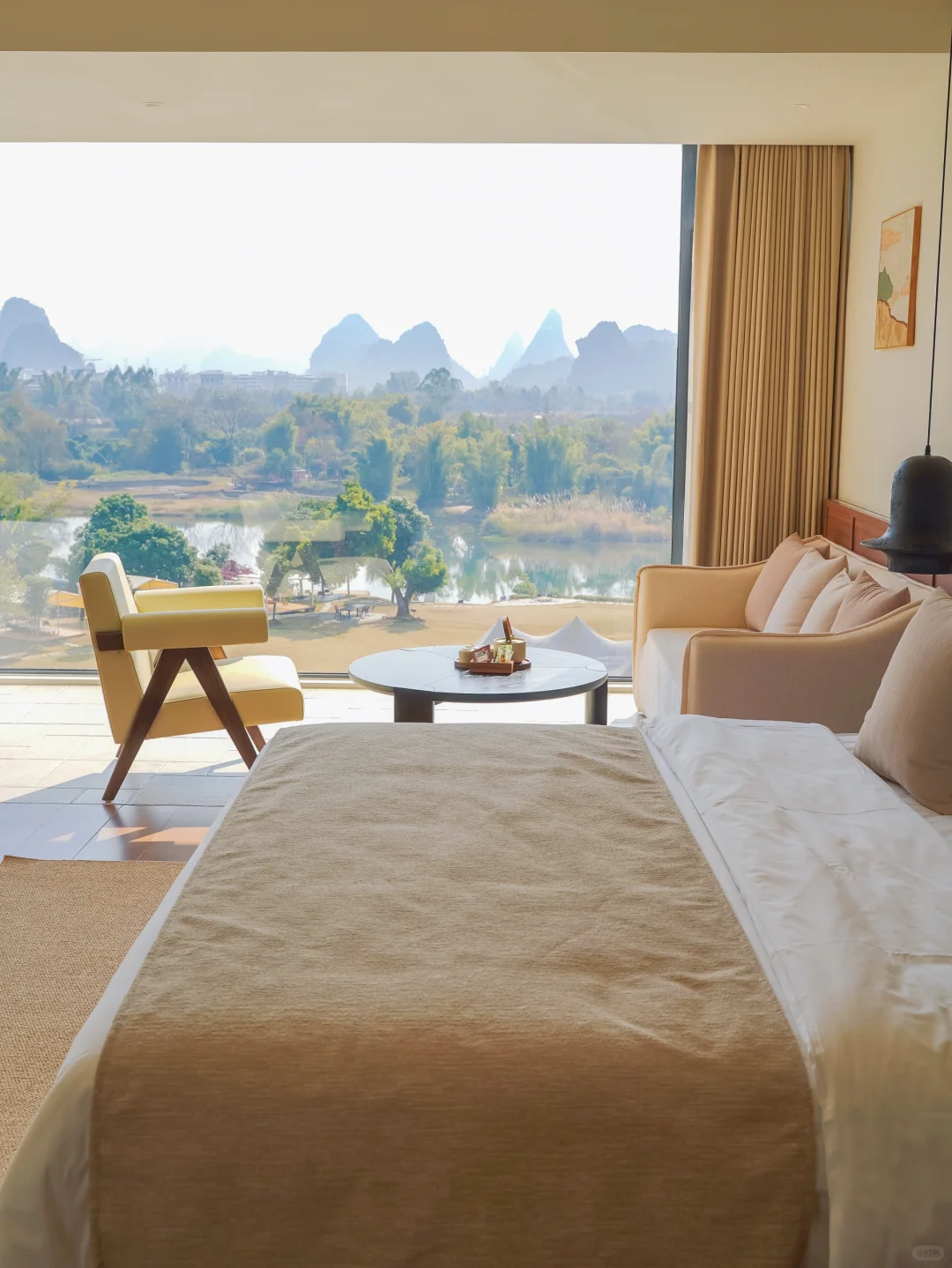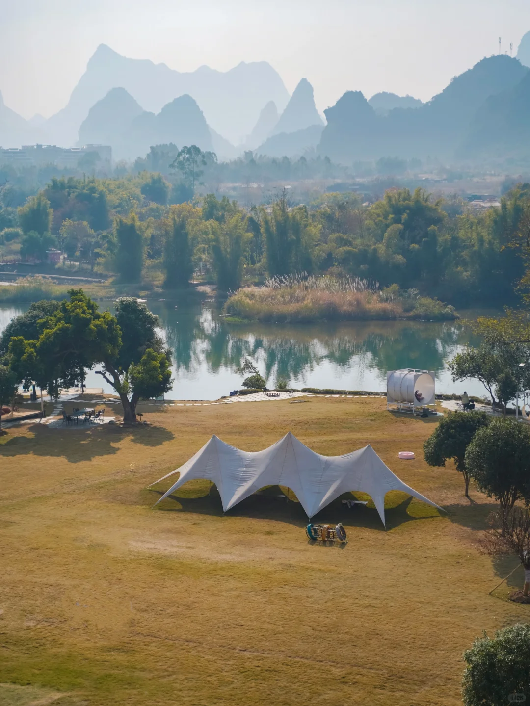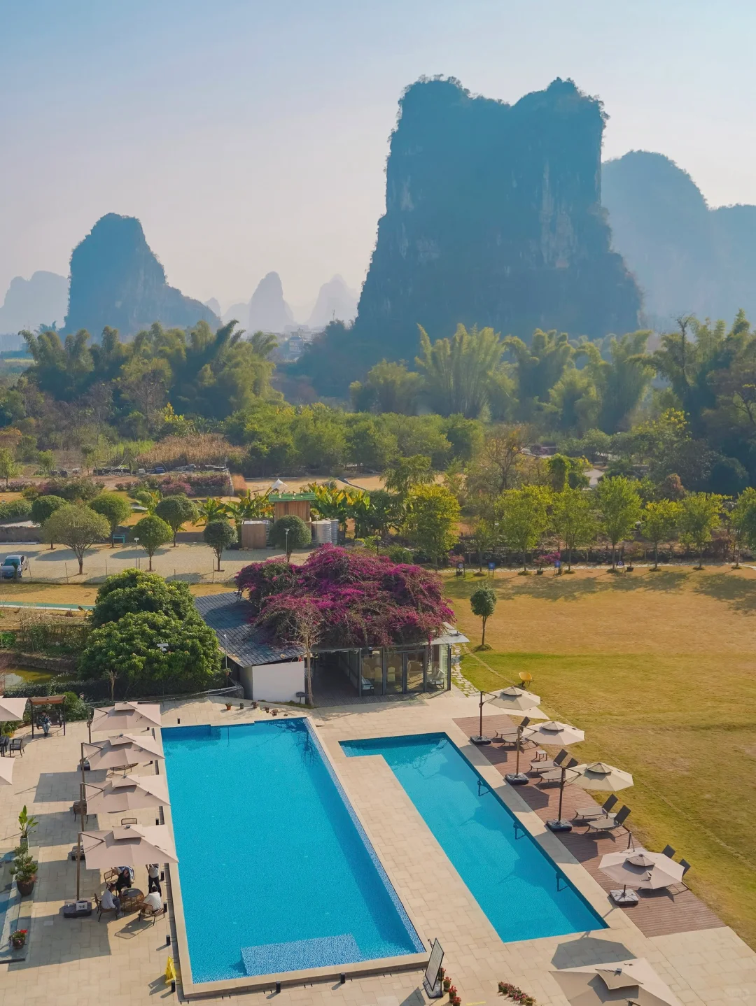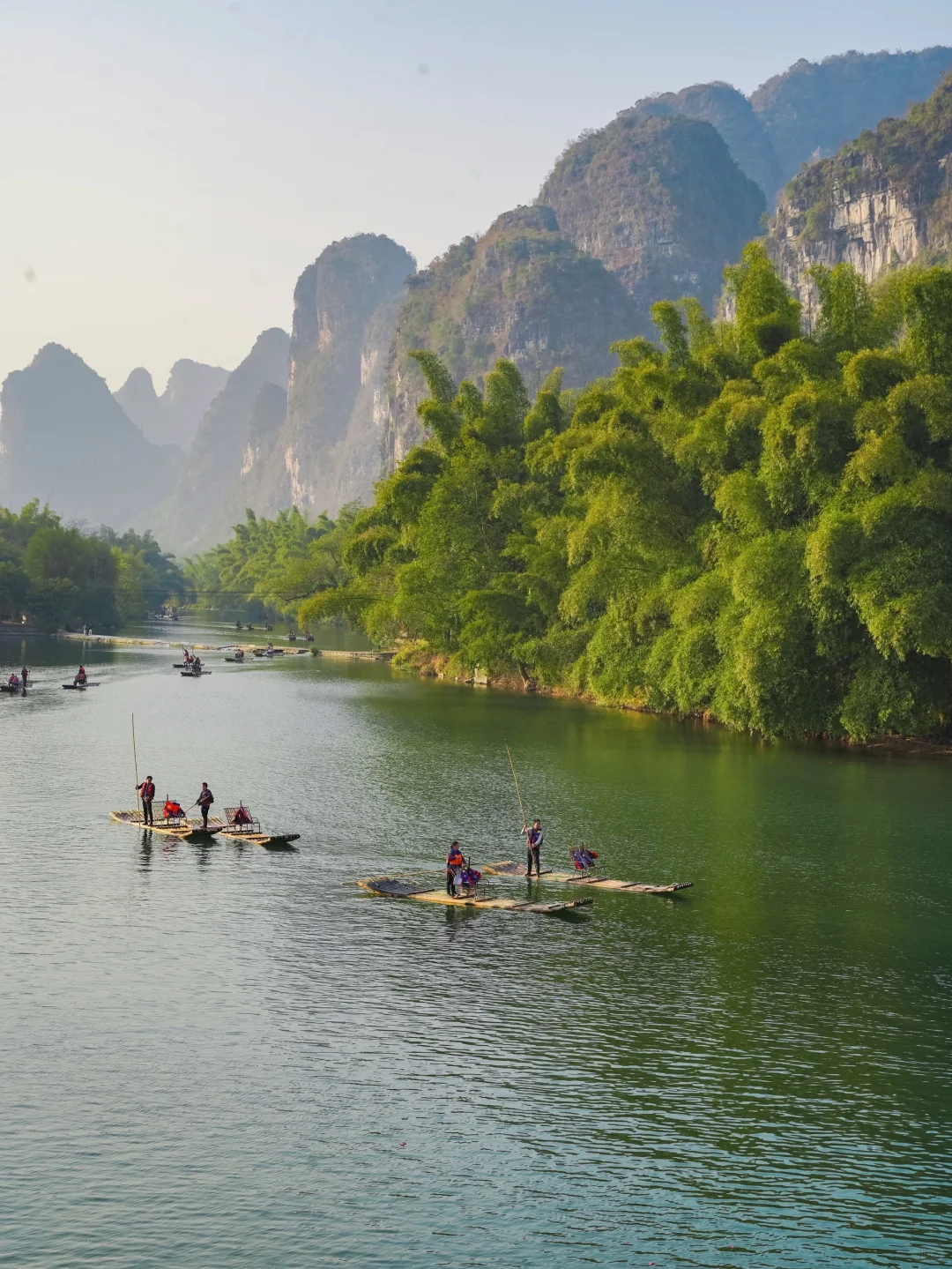 阳朔精华景点都集中在十里画廊里,适合骑着小电动环线游玩,穿梭在山水之间,也可以体验遇龙河的人工手撑竹筏漂流。这边也有不少山水稻田咖啡店,适合摆烂。十里画廊过去桂林千古情和西街也比较方便。