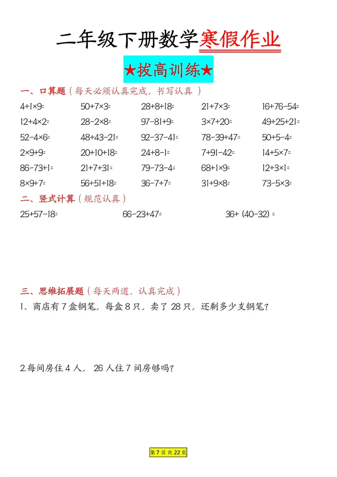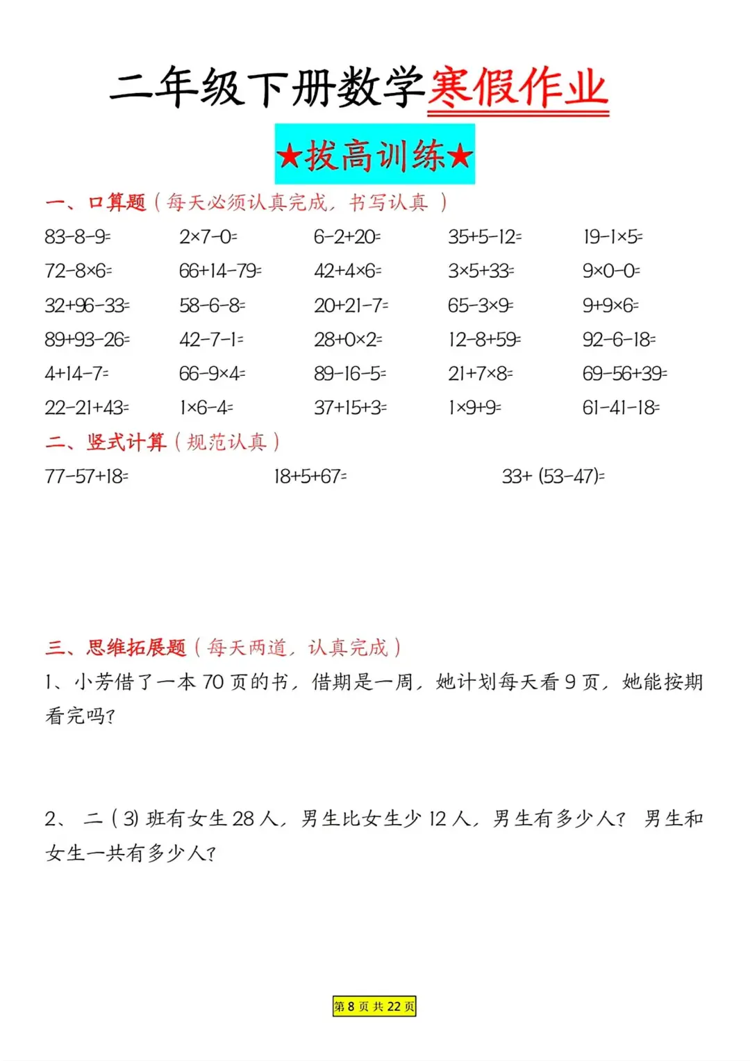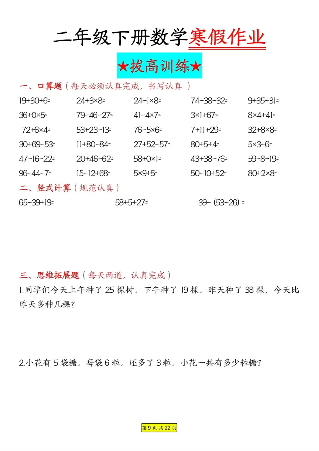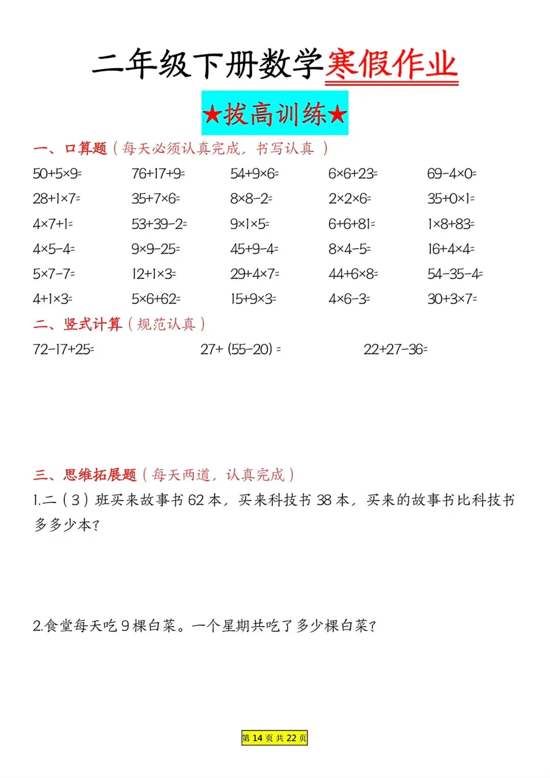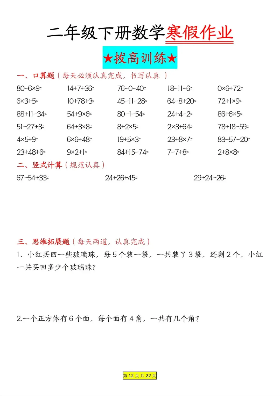 二年级数学 寒假作业 每日一练