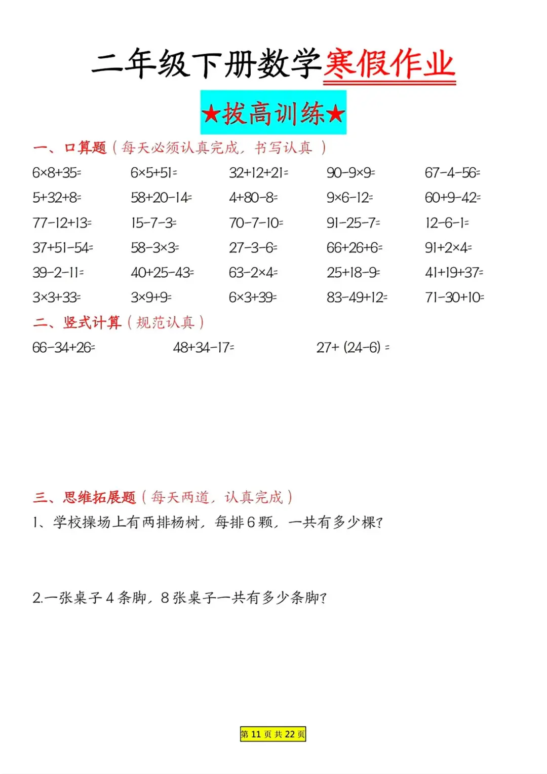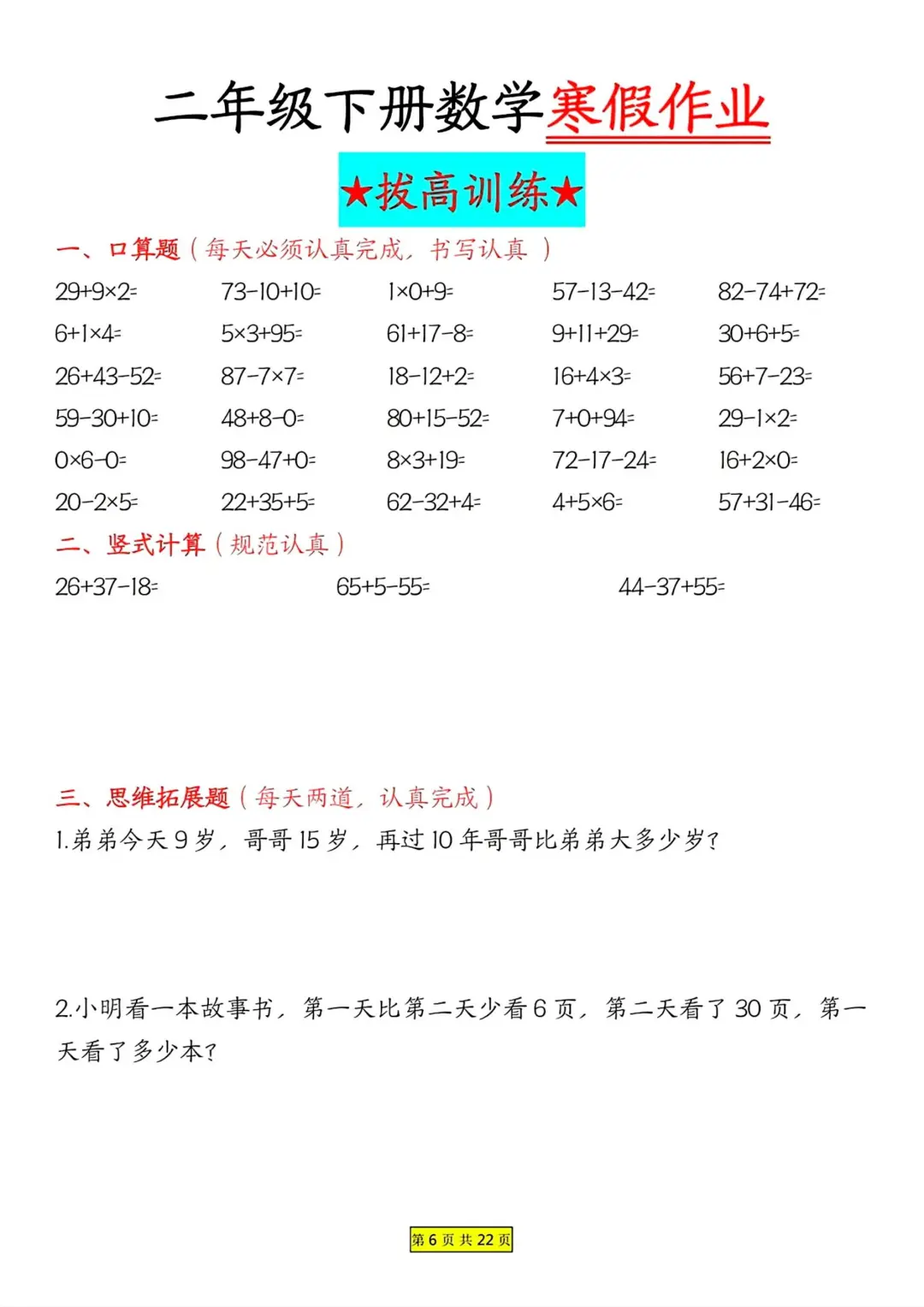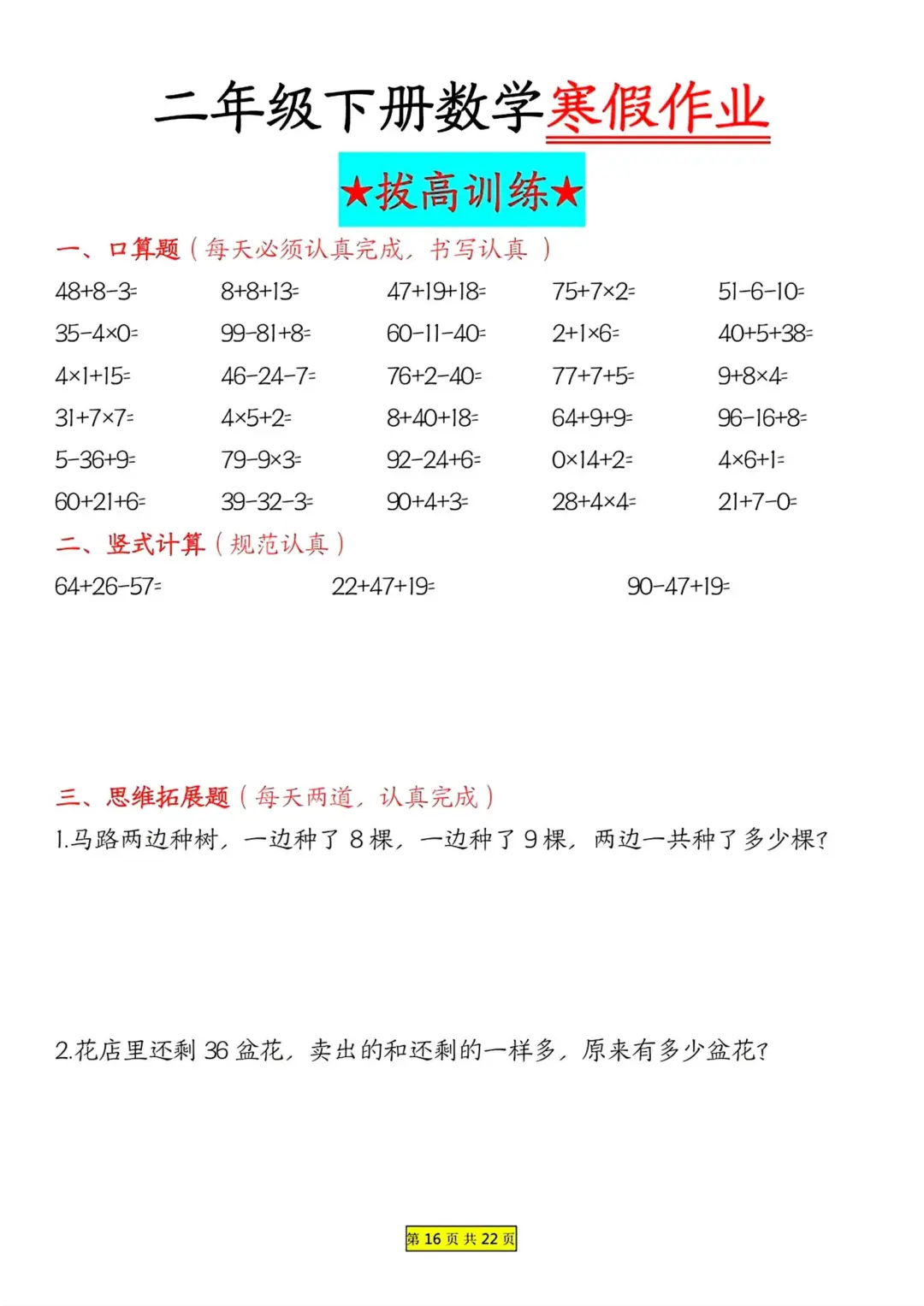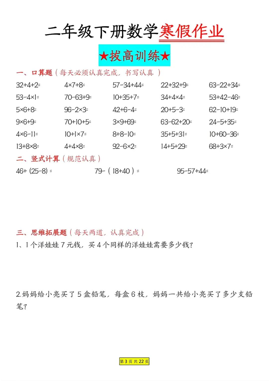 二年级数学 寒假作业 每日一练