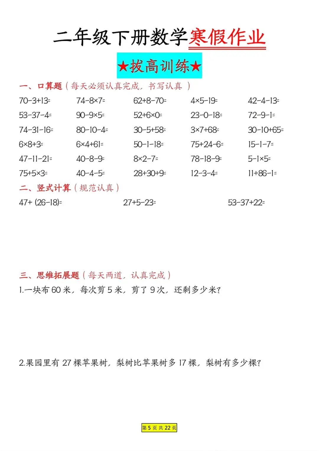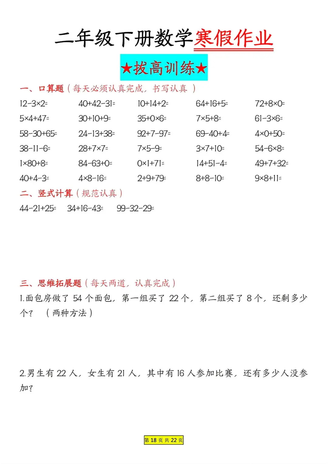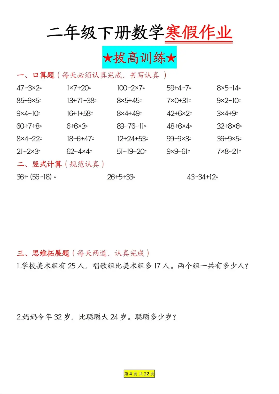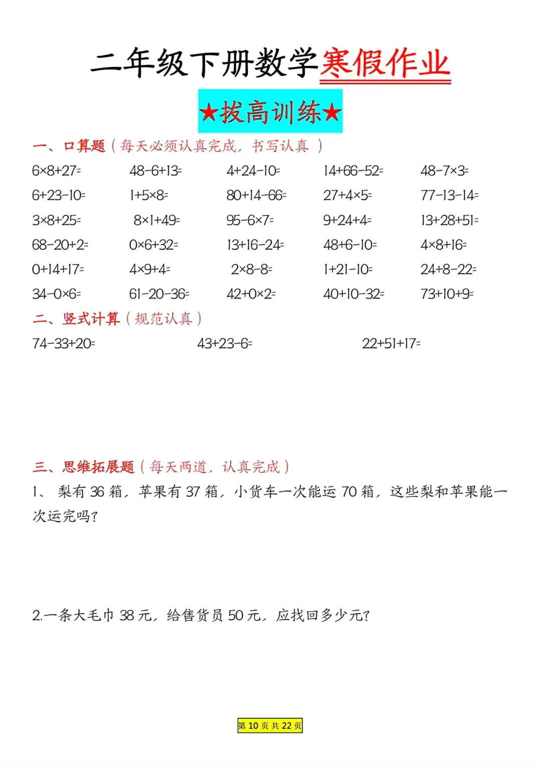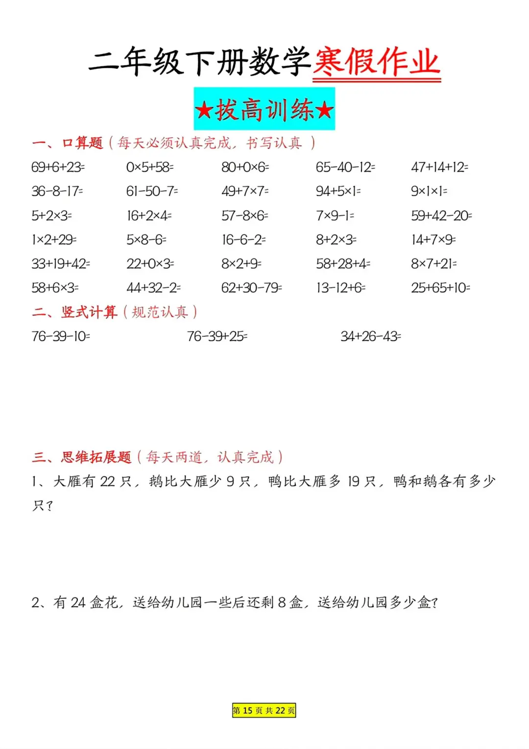 二年级数学 寒假作业 每日一练