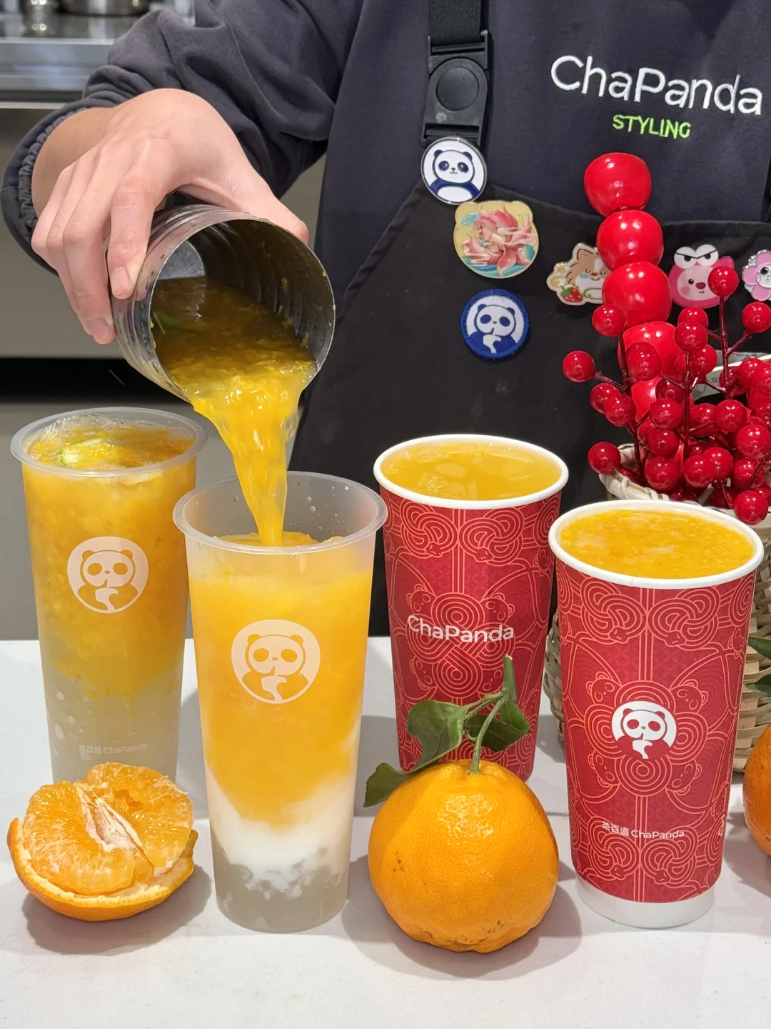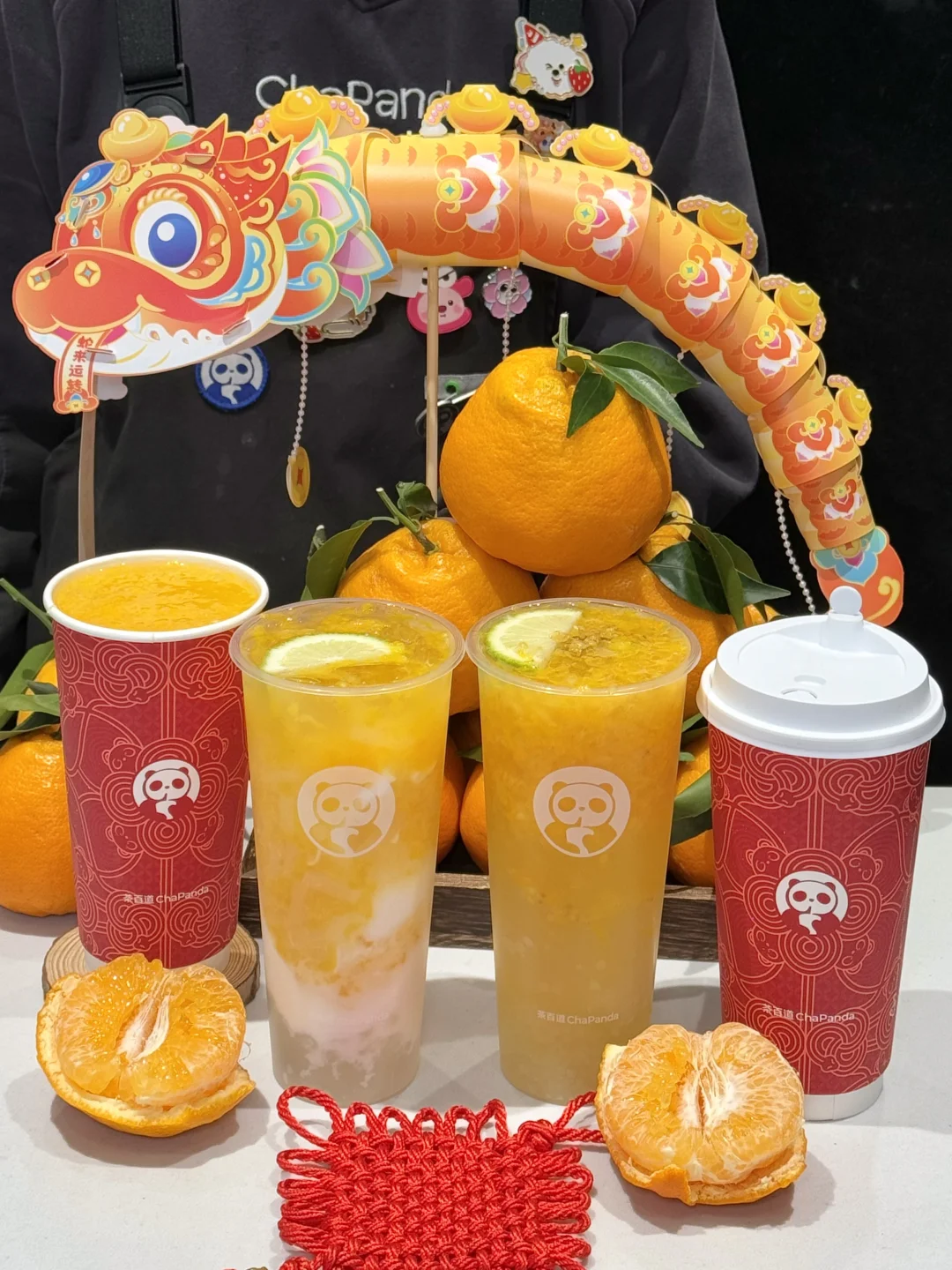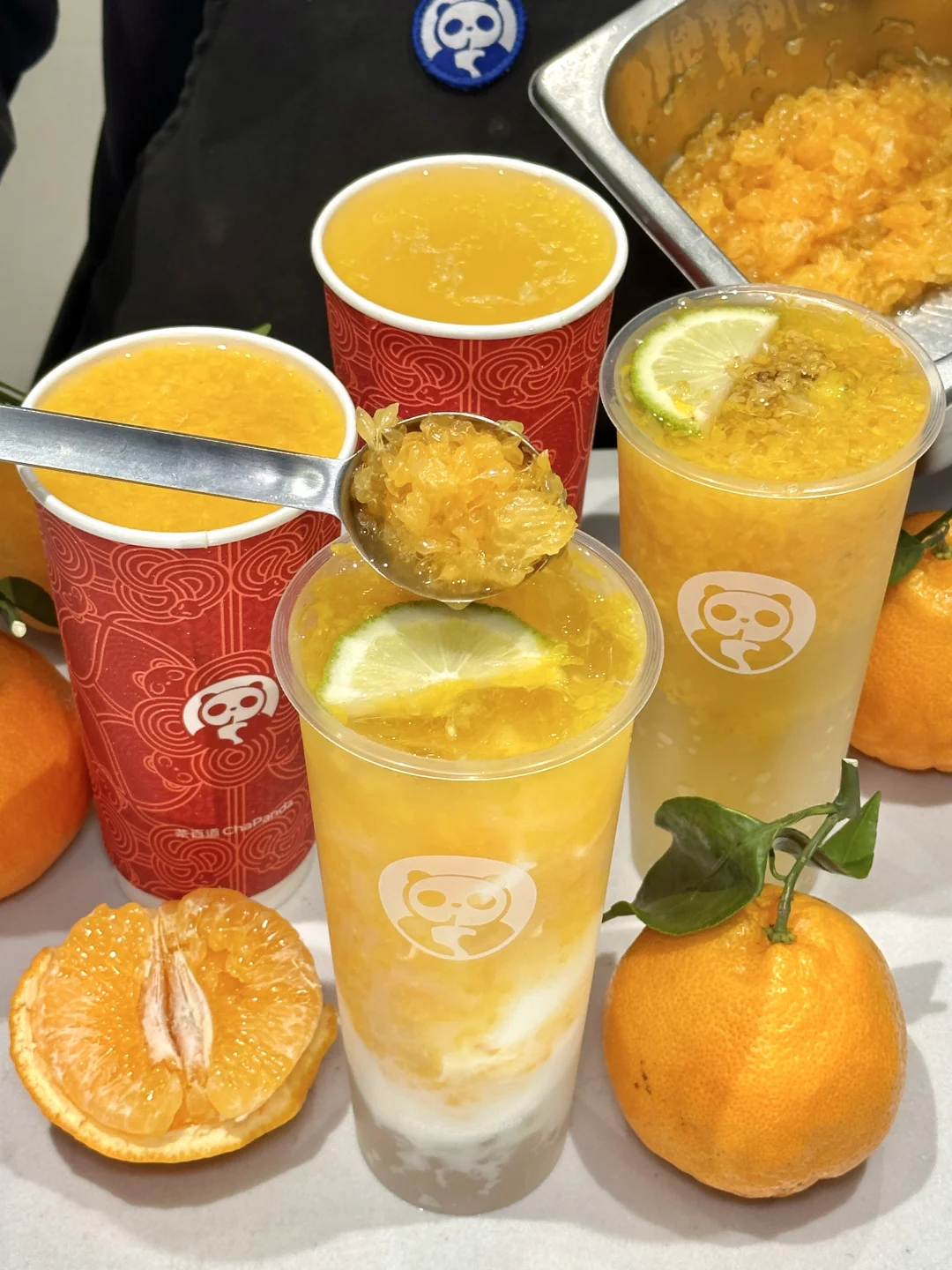 茶百道你……员工的命也是命! 每一个处理步骤都写的非常清楚。 手动去皮剥络你就喝吧😅一喝一个不吱声 因为真的能喝到一整颗耙耙柑,好清爽好好喝!!还偷拍到了㊙方果然真材实料。。只剩柑了😂😂 热饮是新年杯!浑身blingbling的巨巨好看!! 新年必须和好朋友一人一杯敲满足!!! · 🍊蜀实耙耙柑&耙耙杠上花 这两杯都是满满的Vc,每一口都能嚼到香甜的耙耙柑果肉! 喜欢桂花的可以选杠上花!里面有桂花糖~ 蜀实耙耙柑选热饮可以不含茶。另外可以加自己喜欢的小料!口感更丰富!! ·
