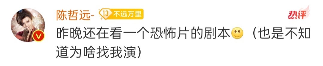 陈哲远在看恐怖片剧本 陈哲远回应密逃好笑,说自己昨晚还在看一个恐怖片的剧本,也不知道为啥找他演哈哈哈哈哈!