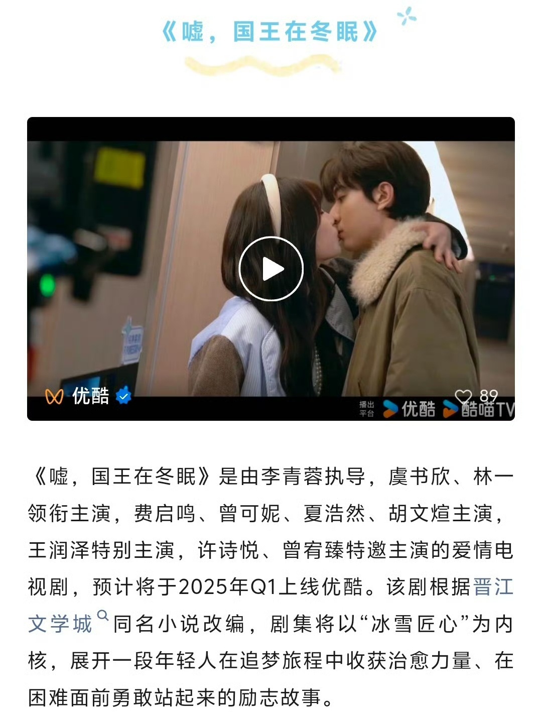 嘘国王在冬眠开始招商 虞书欣、林一主演的《嘘,国王在冬眠》开始播前招商了,暂定Q1播出,又能看到欣欣子了!