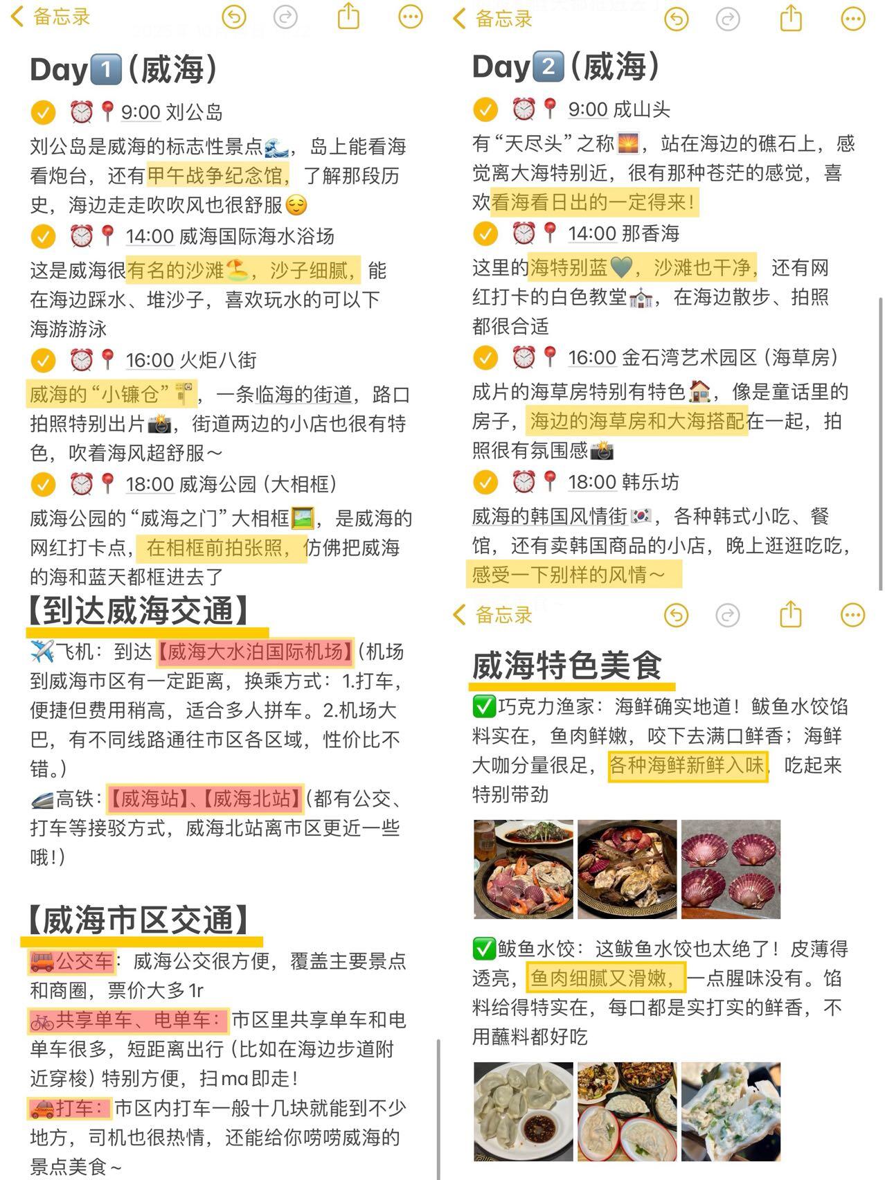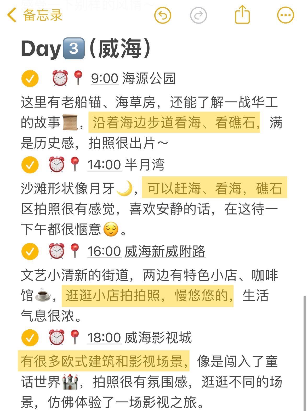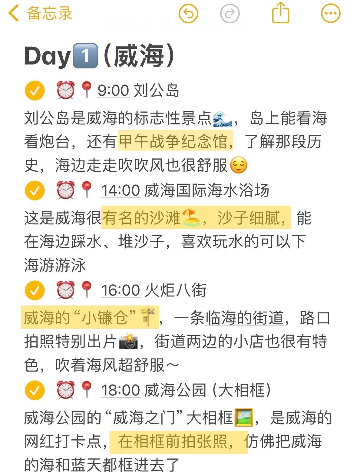 ⏰9:00-12:00 刘公岛→⏰14:00-16:30 威海国际海水浴场→⏰17:00-18:00 火炬八街→⏰18:30-20:00 威海公园(大相框)