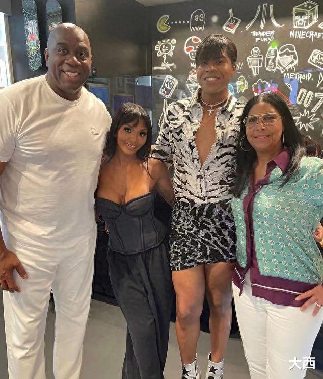 二儿子EJ酱名气就很大了,他的身高和魔术师旗鼓相当,在2米05左右,并且也是身体天赋异禀。不过EJ酱却对篮球完全不感兴趣,并且性别认知也与众不同,如今的EJ酱成为了一名模特,还是时尚圈的宠儿,魔术师对他也是宠爱有加,同样非常幸福。