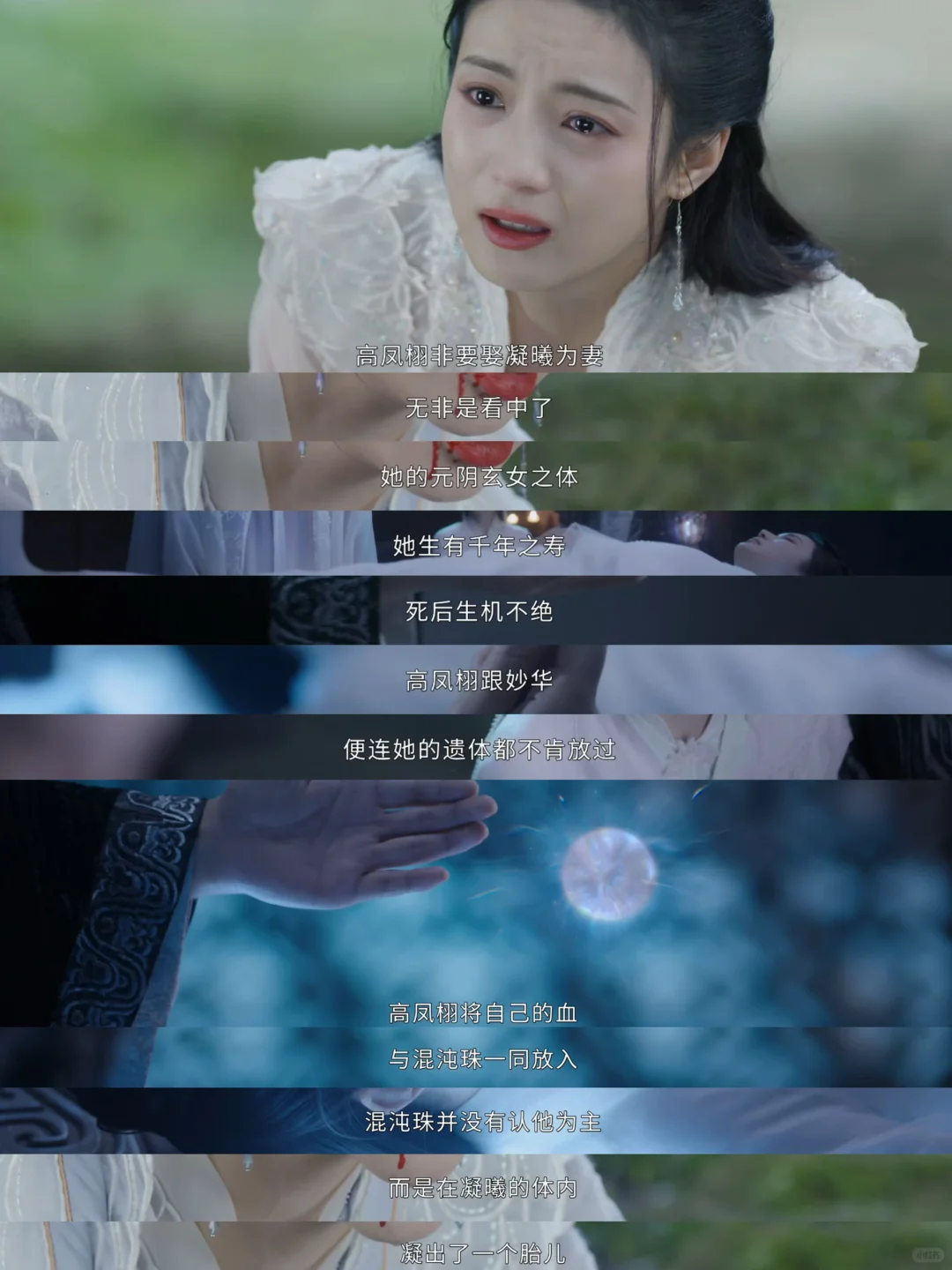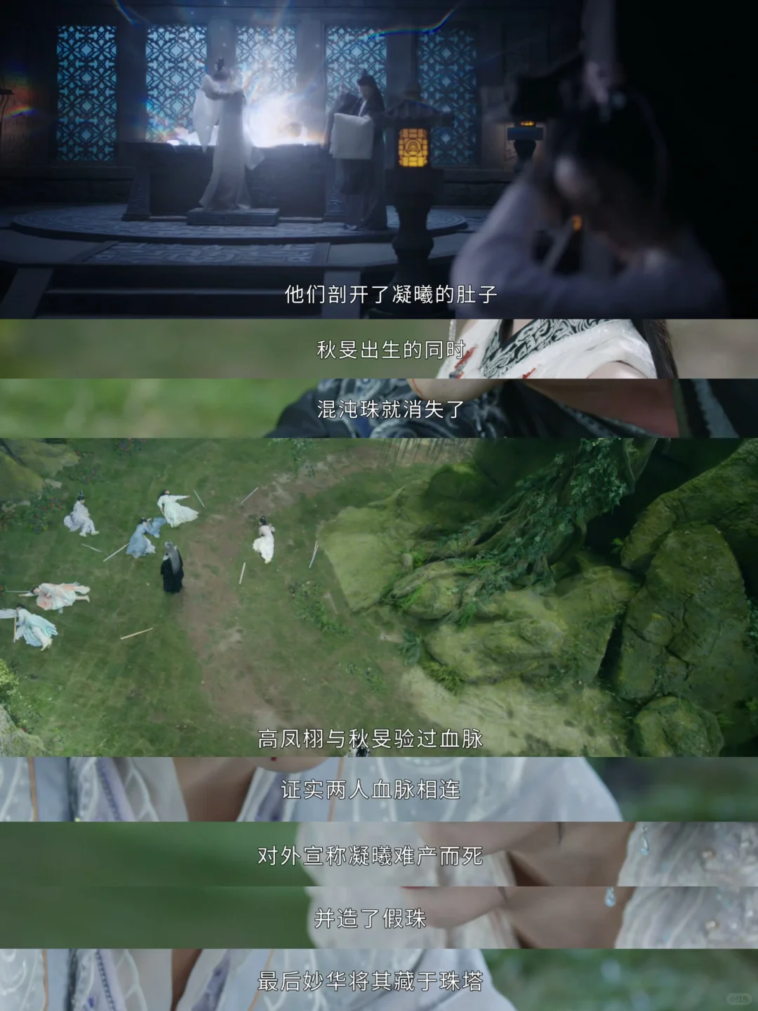 原来素凝真是姐控,素凝曦要和桑岐隐居,她为了留下姐姐找师父告状,并假扮姐姐前去赴约,偷了姐姐的春生剑,趁其不备砍下他的手臂,然后举全宗之力对付他。 回去之后师父告知素凝曦,桑岐已被挫骨扬灰,素凝曦服下芳菲尽殉情,素凝真代替素凝曦嫁给高凤栩。 原来高凤栩想要娶素凝曦只是看中了她的元阴玄女之体。高企图将混沌珠占为己有,不惜用素凝曦的S体温养宝物,混沌珠在素凝曦体内凝出胎儿,高秋旻出生,混沌珠就消失了,所以误以为高秋旻就是混沌珠。 其实暮悬铃才是!