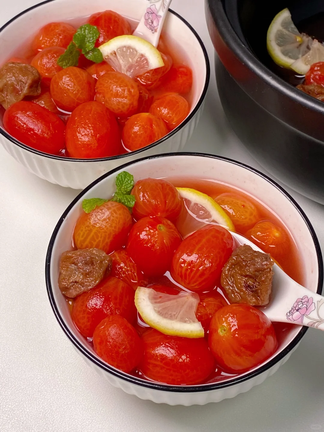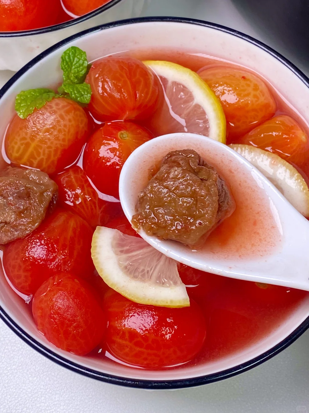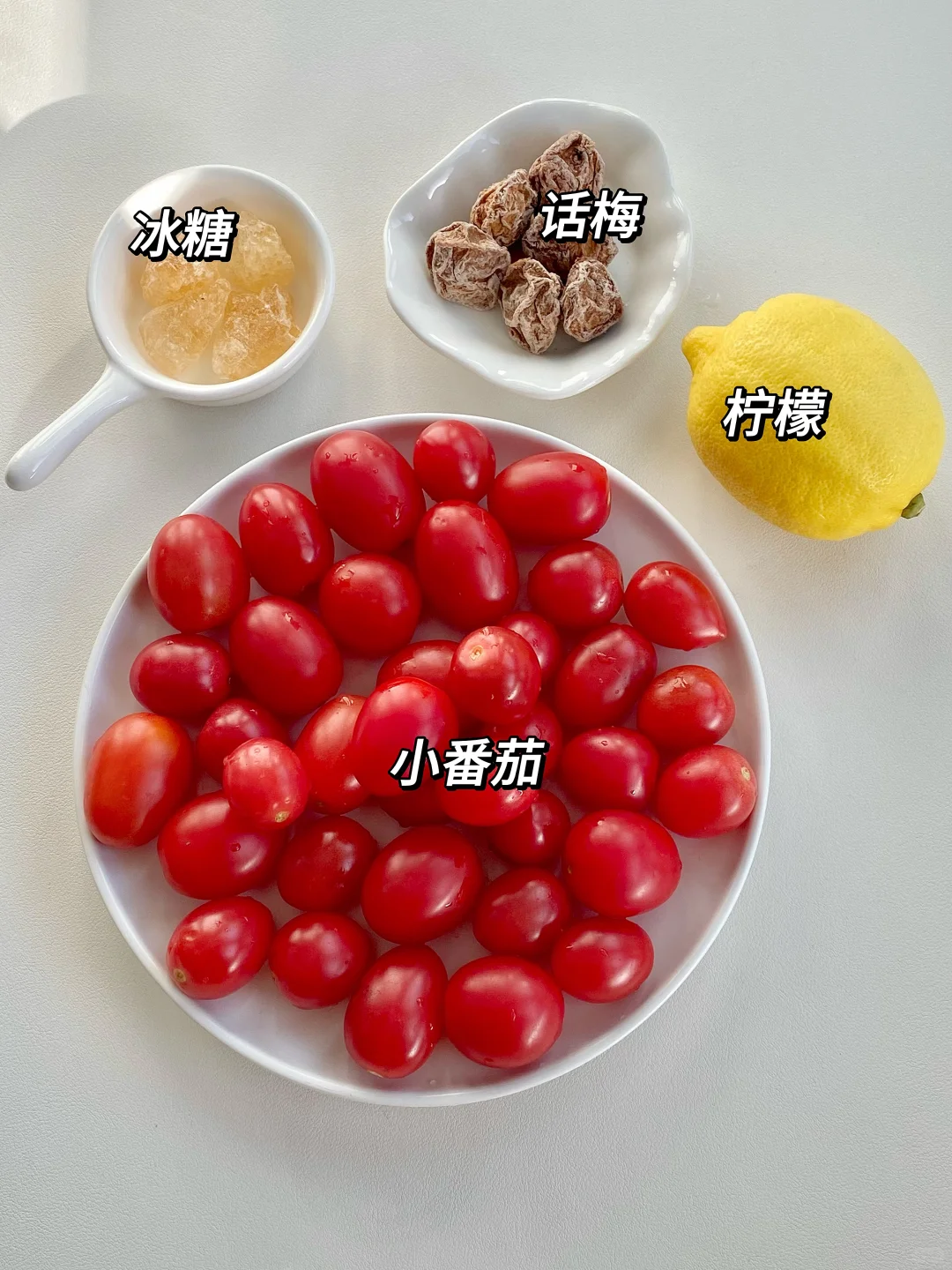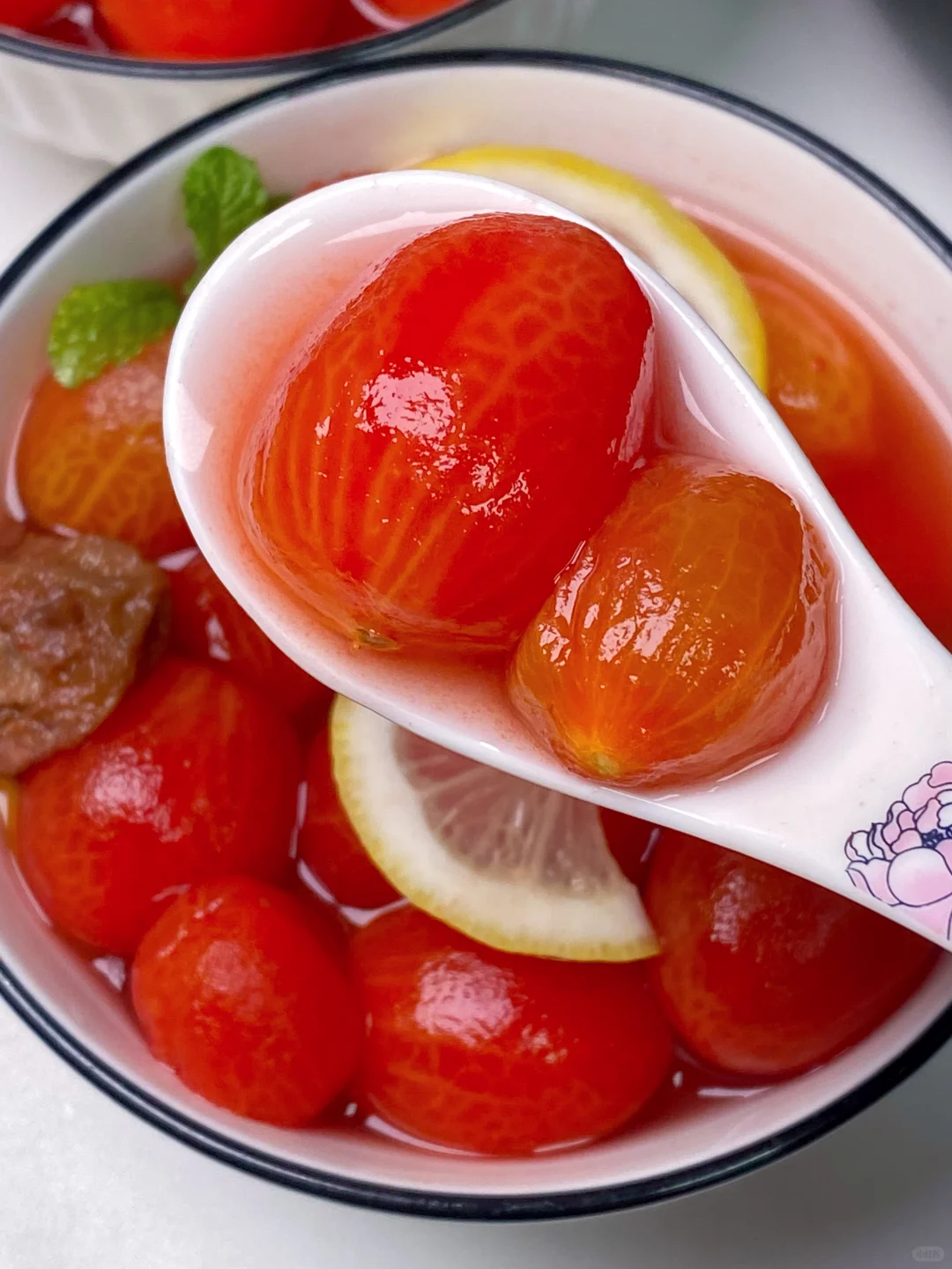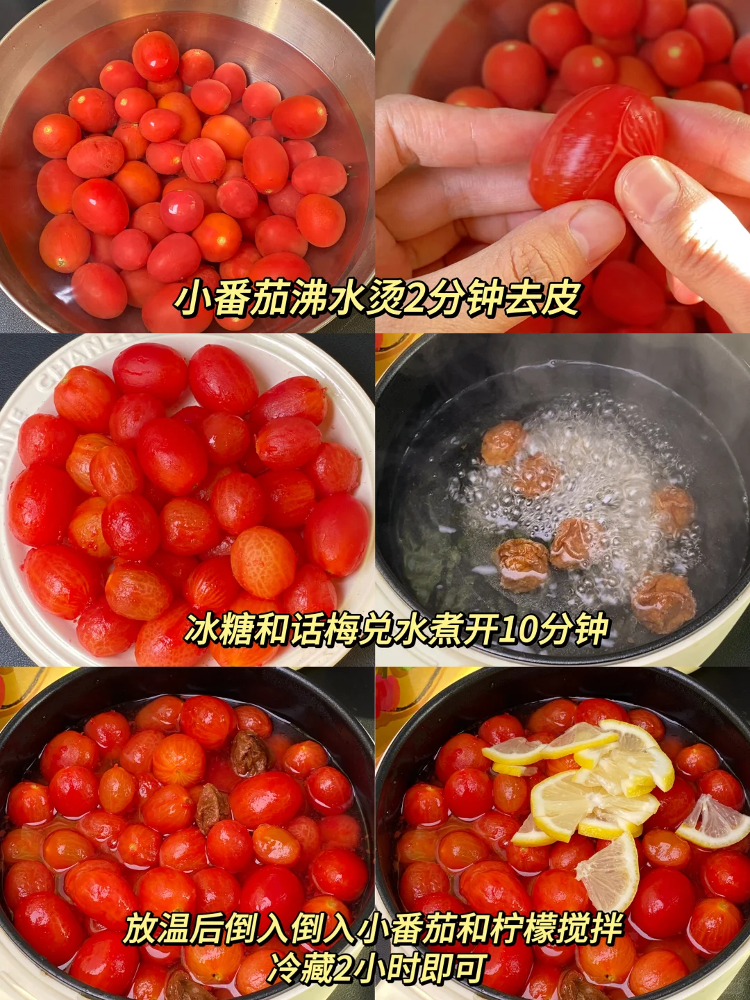 梅渍小番茄!口感真的惊艳啦!![黄金薯R] 年夜饭桌上一定要有它!酸酸甜甜的贼清爽!! 一口爆汁!!还带着话梅的咸香!! 真的巨巨巨巨解腻~贼好吃😋 📝小番茄、话梅、冰糖、柠檬 🥣做法: 1⃣️小番茄热水泡2分钟好去皮 2⃣️话梅冰糖兑水煮开10分钟 3⃣️倒入小番茄和柠檬片搅拌一下,放凉冷藏2小时即可 大鱼大肉后来上一碗!巨清爽解腻!! 自己做真的简单!清爽酸甜老开胃了👍