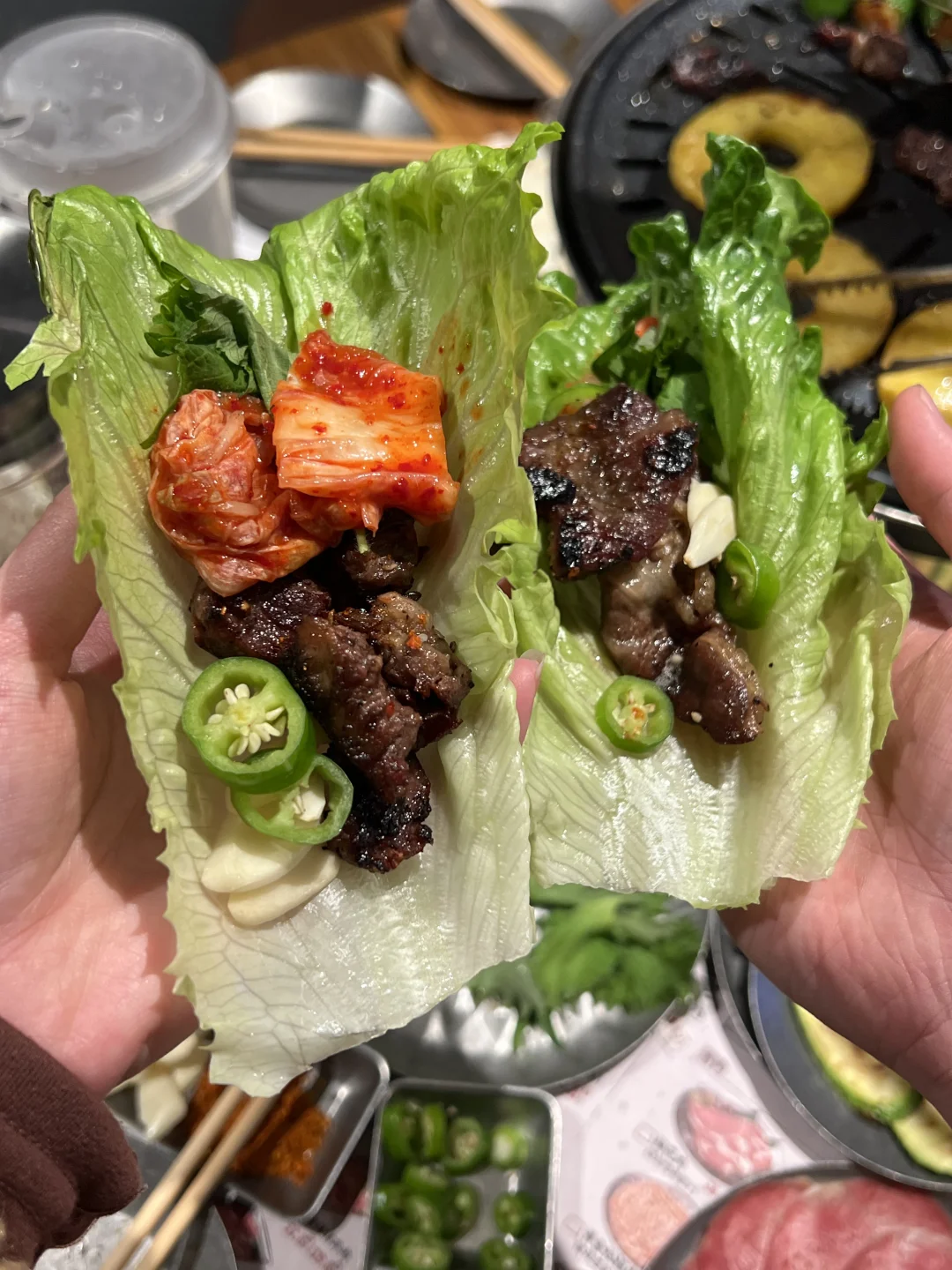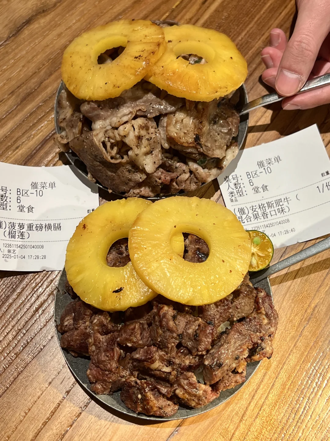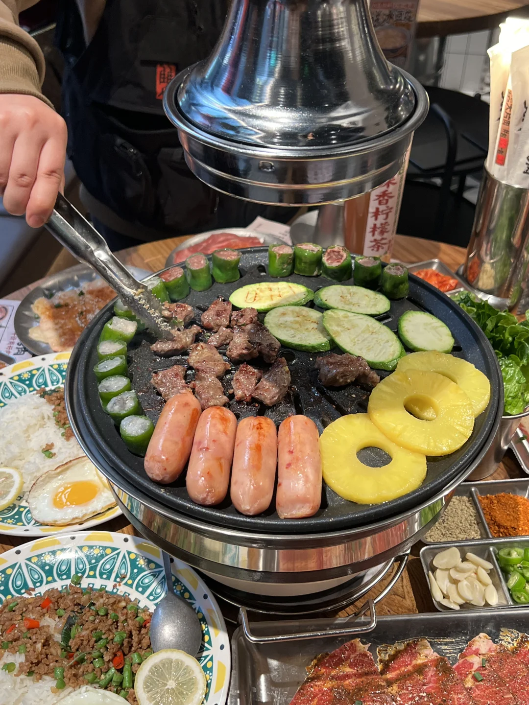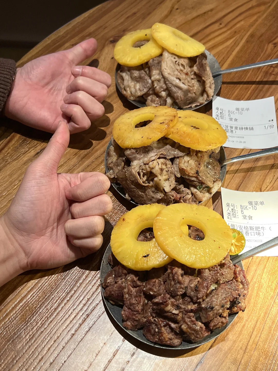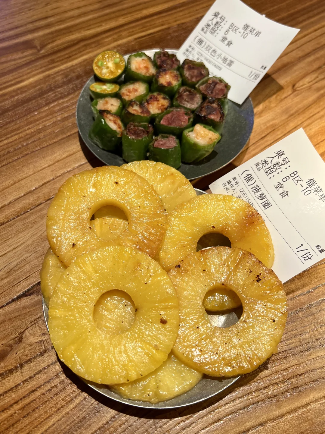 吃到了双色小地雷,小青椒里面满满的新鲜虾肉,烤的滋滋冒油 外焦里嫩,一口一个根本停不下来! 还有打抛饭,菠萝重磅横膈膜,安格斯肥牛,菠萝圈都好吃🥹