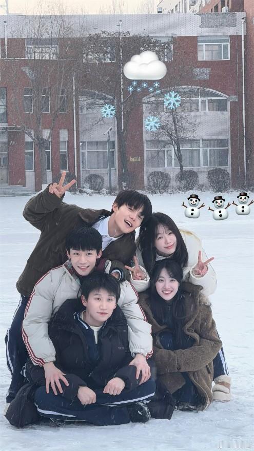 三人行演员合照 徐梦洁晒和马天宇、谢兴阳、曾宥臻、孙羽凡三人行剧组演员合照,大