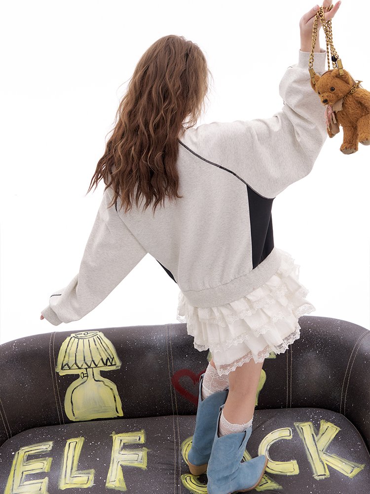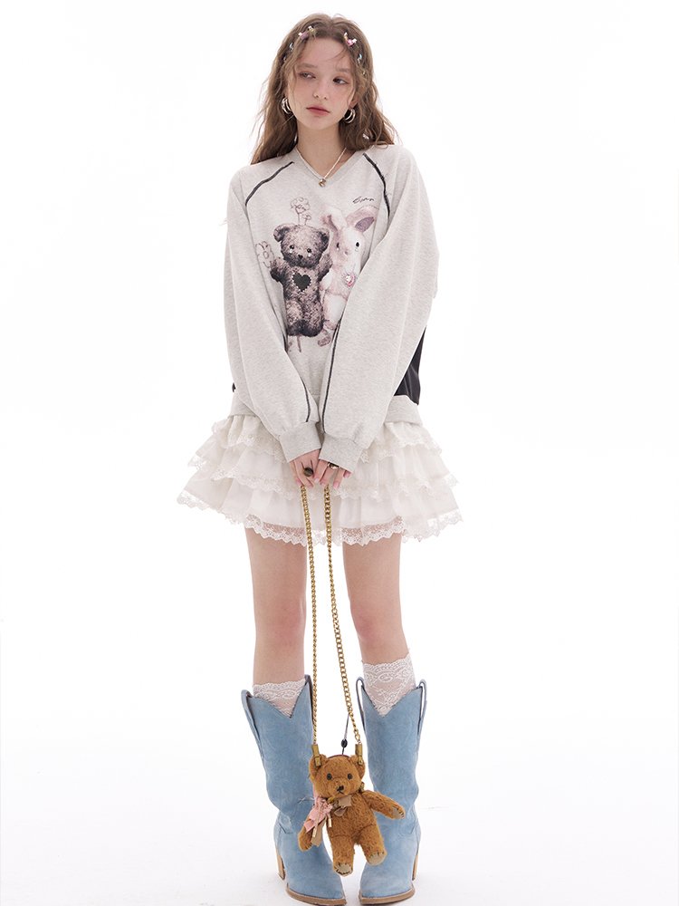 1.小熊图案印花设计,黑色小熊爱心烫钻设计 2.拼接结构设计,双层蕾丝拼接,下摆拼接亮珠感蕾丝花边 风格:甜酷-运动-混搭