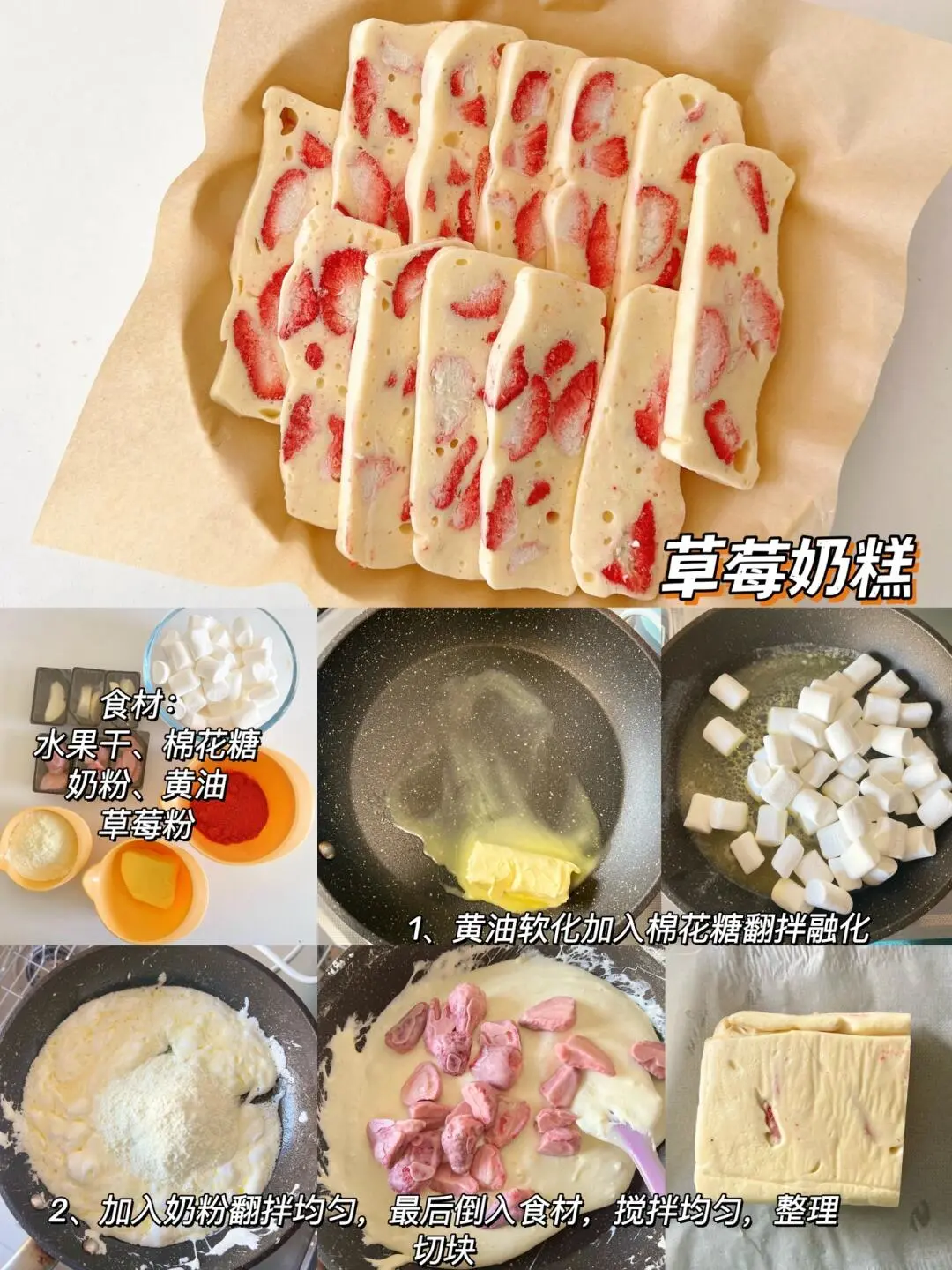 食材:草莓冻干适量、黄油50克、棉花糖150克、(水饴5克,我没有加)、奶粉70克