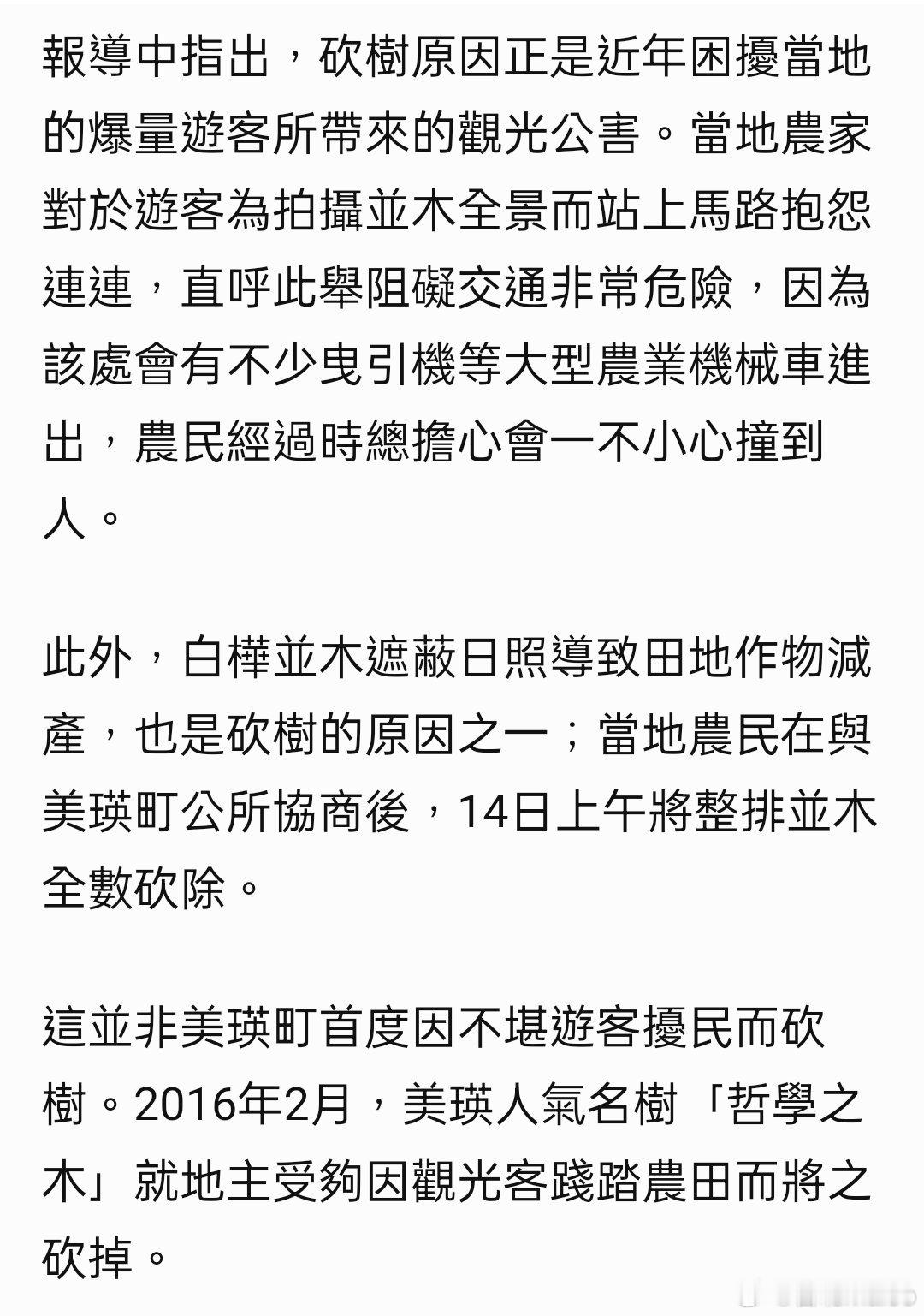 受夠遊客干擾+影響收成 北海道美瑛砍掉人氣白樺並木 ;樹木何罪之有? 應該建議日本政府不接受外國觀光客才對!!