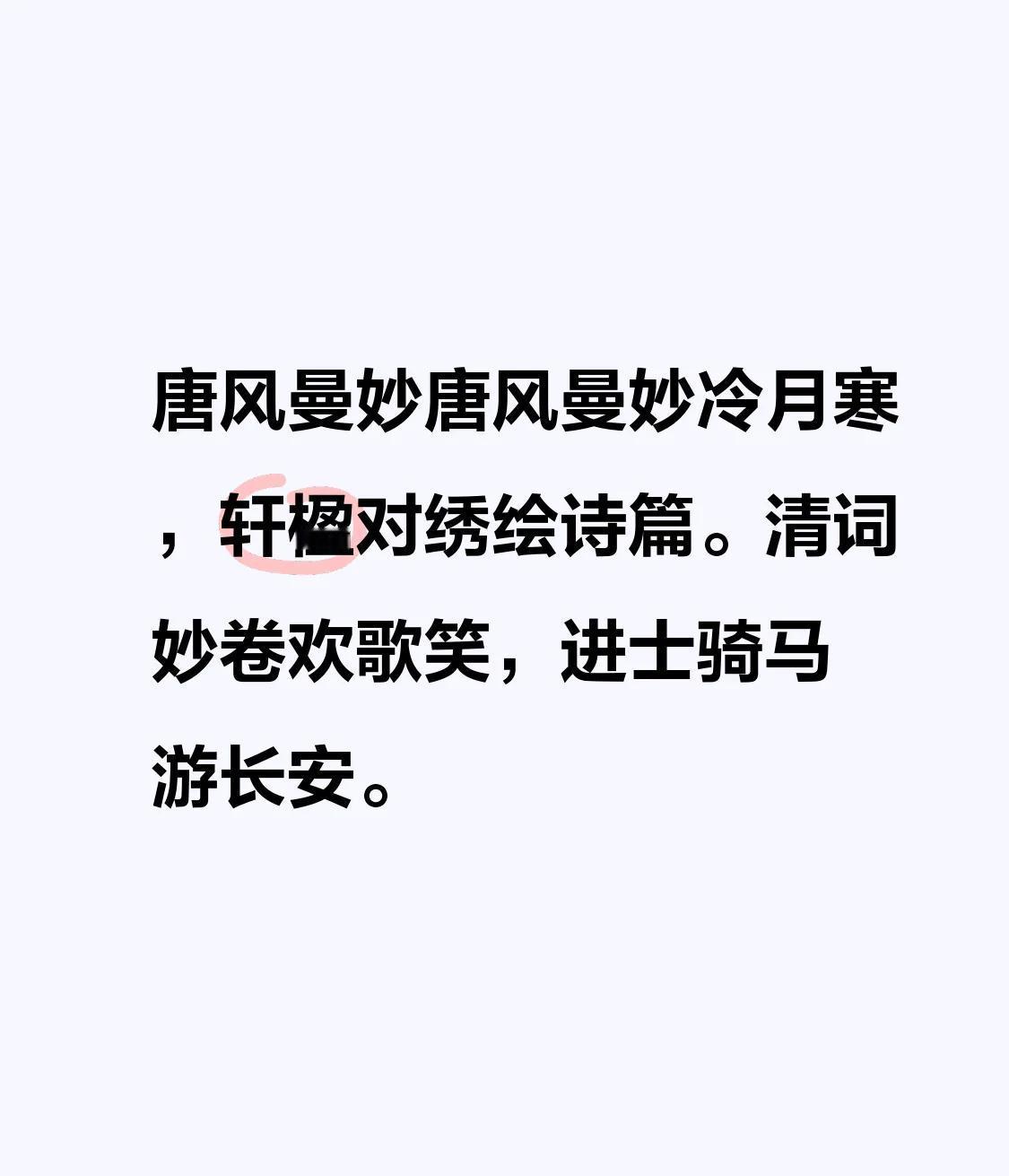 唐风曼妙 唐风曼妙冷月寒, 轩楹对绣绘诗篇。 清词妙卷欢歌笑, 进士骑马游长安。