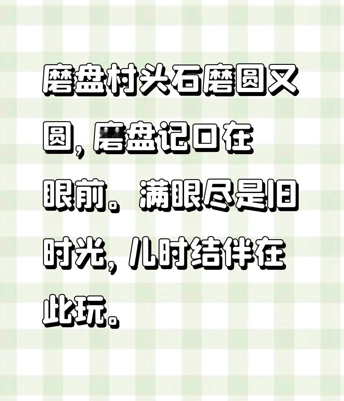 磨盘 村头石磨圆又圆, 磨盘记口在眼前。 满眼尽是旧时光, 儿时结伴在此玩。