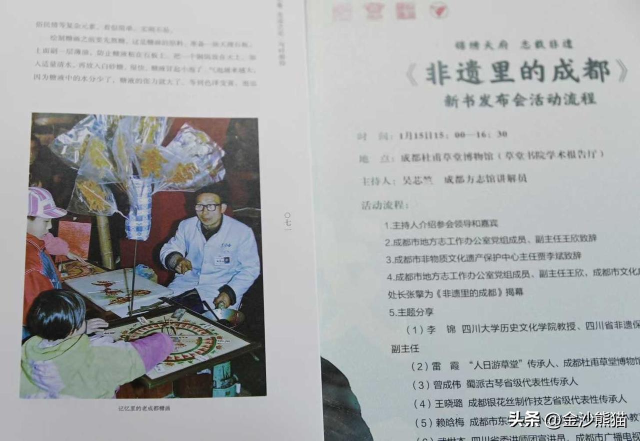 新书《非遗里的成都》 由成都市方志办、四川人民出版社等部门联合编纂的新书《非遗里的成都》。1月15日在成都杜甫草堂博物馆正式发布。有幸本人有两幅照片入册发行。能用图片支持成都非遗的传承是我最大的幸事。同时数名成都非遗传承人到会并发表感言。 图文:专业摄影师 李豫龙