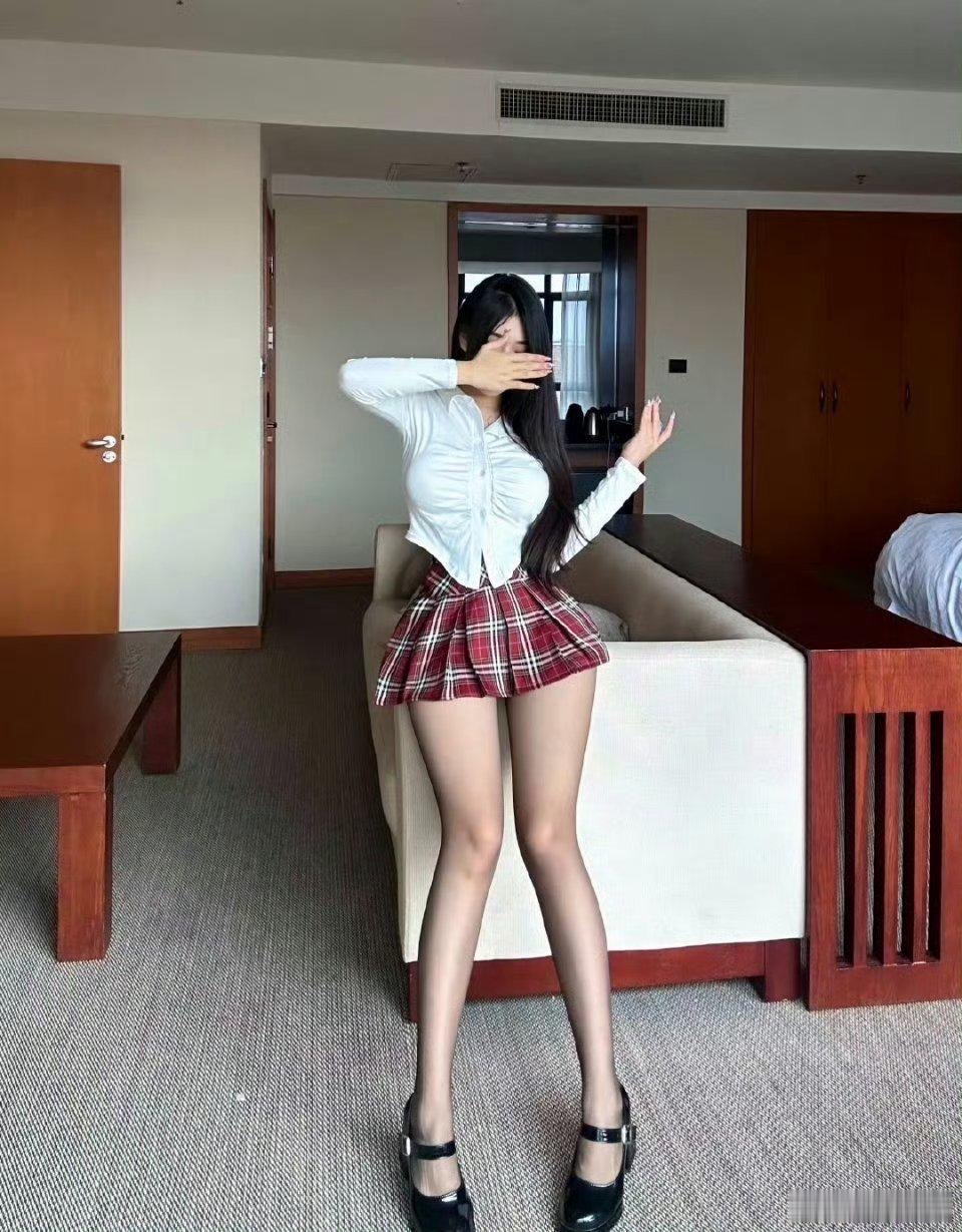 白上衣配格裙,黑丝搭黑鞋,尽显青春活力。