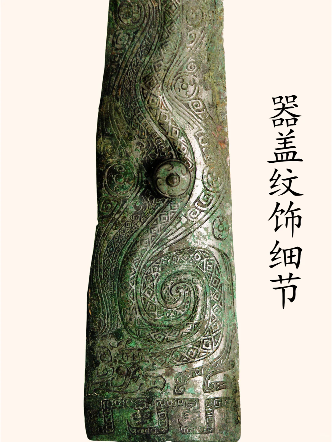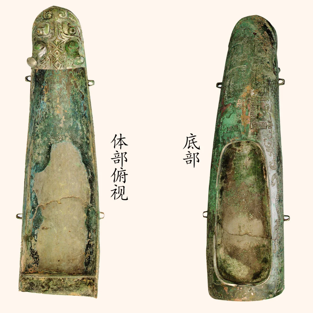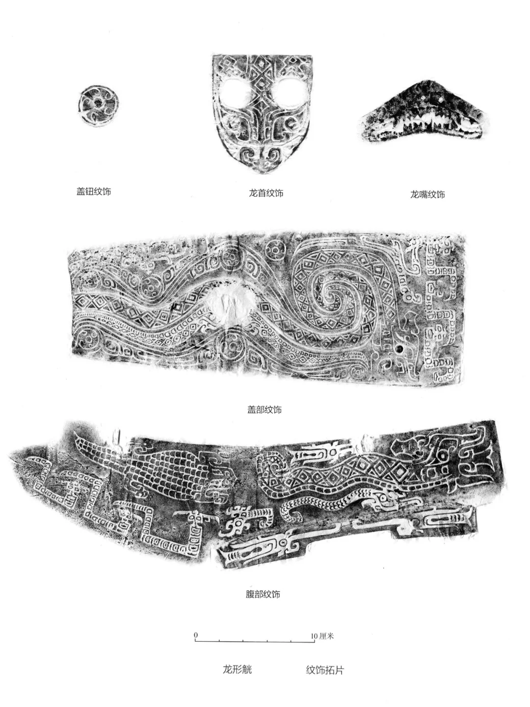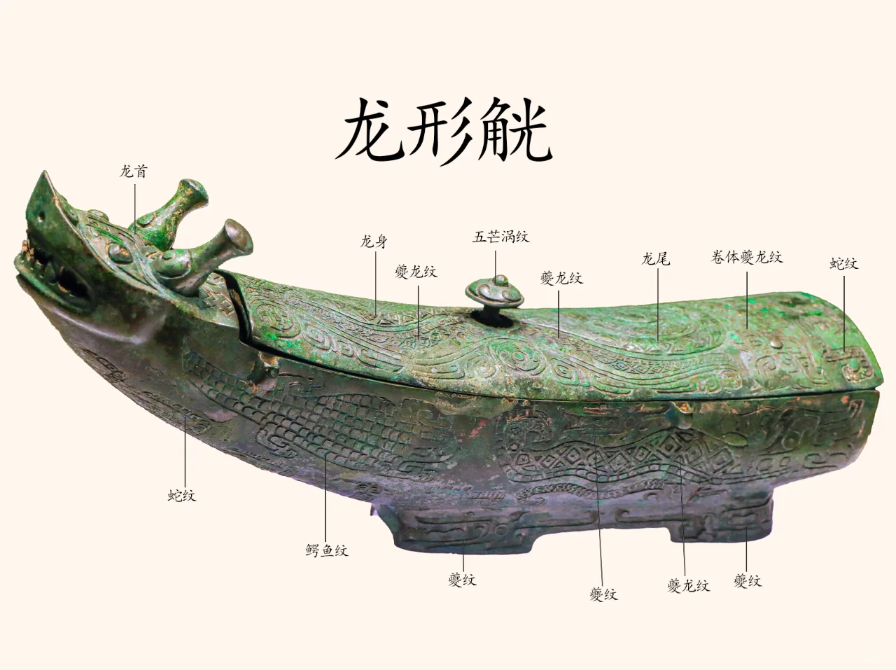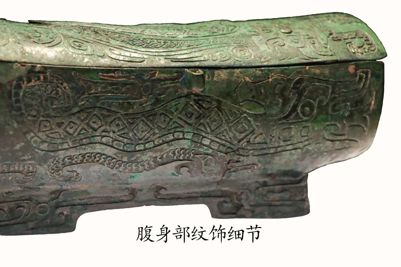 纹饰:器身遍饰华丽精美的纹饰。盖面中间为浅浮雕的逶迤龙身,中部拱起,尾巴上卷,与器物前端的龙头相衔接,形成一个立体圆雕与平面浮雕的组合。此外,还饰有几条同样起伏的波浪线,增加了整体的韵律感,似乎一切都在波动前行。空隙处填以三角云纹和涡纹。器盖上凸出的盖钮也饰同样的涡纹,从上方看,盖钮与盖面融为一体。盖面的后部,尽管空间有限,却经过精心布局,巧妙地融入了一龙一鸟与三条蛇的图案。其中,最为引人注目的是排列成行的三条蛇,它们身形蜿蜒,尖嘴圆眼,展现出一种独特的动态美感。在蛇与主龙龙尾之间,一龙一鸟并排而立,龙头显得尤为硕大,其眼神圆睁,透露出臣服与威严,柱状之角更添几分神圣气息。龙口大张,从中吐出花朵般的舌头,形态生动逼真。而龙尾则巧妙地顺着主龙的龙尾盘卷而上,两尾相互环绕,形成了一种回旋往复、生生不息的态势。在剩余的小空间中,还精心装饰了一只鸟,其喙部弯曲如钩,尾部尖锐如刀,形态矫健有力,为整个图案增添了几分灵动与生气。器身的两侧饰有鳄鱼纹(扬子鳄)和夔龙纹。扬子鳄,为我国特产动物,分布在长江下游地区,以安徽的青弋江沿岸以及太湖流域沼泽地为主产地。两侧后部主体装饰以龙纹,该龙纹与盖面后部的龙纹造型相互呼应,呈现出臣眼圆睁、柱状立角、张口吐舌、舌如花朵绽放、长身拱曲、尾部上扬的生动形态。在主龙之上,巧妙镶嵌着一条鱼纹,而在其下方,则有一条具有臣眼特征的小龙相伴。进一步观察,小龙之后还隐藏着一条更为小巧的小小龙,其身形虽短却利爪毕现,其尾部与小龙的卷曲之尾形成巧妙的对应。