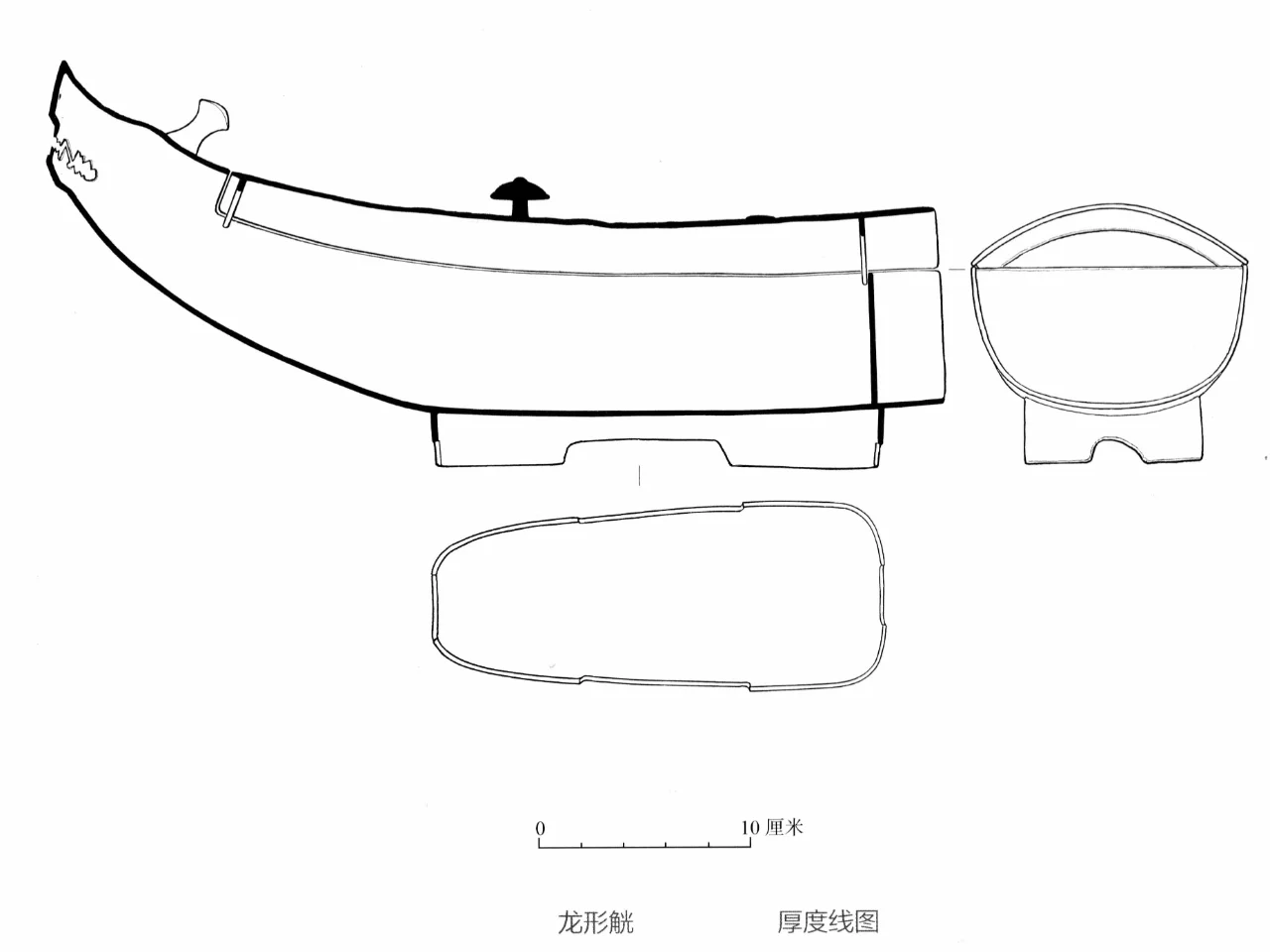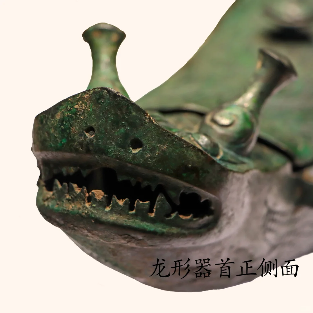 器物介绍:器型:长腹弧鼓,后端截平,背部为弧曲形长盖,内有横榫与器腹扣合。盖面中央有一伞形钮。器身口沿外附有两对贯耳,用来把龙形觥吊起加热酒,另一端没有封口是用来散水蒸气的.器物底部有长方形矮圈足,放置平稳,整体如一停泊的龙舟,造型独特,独具风采。