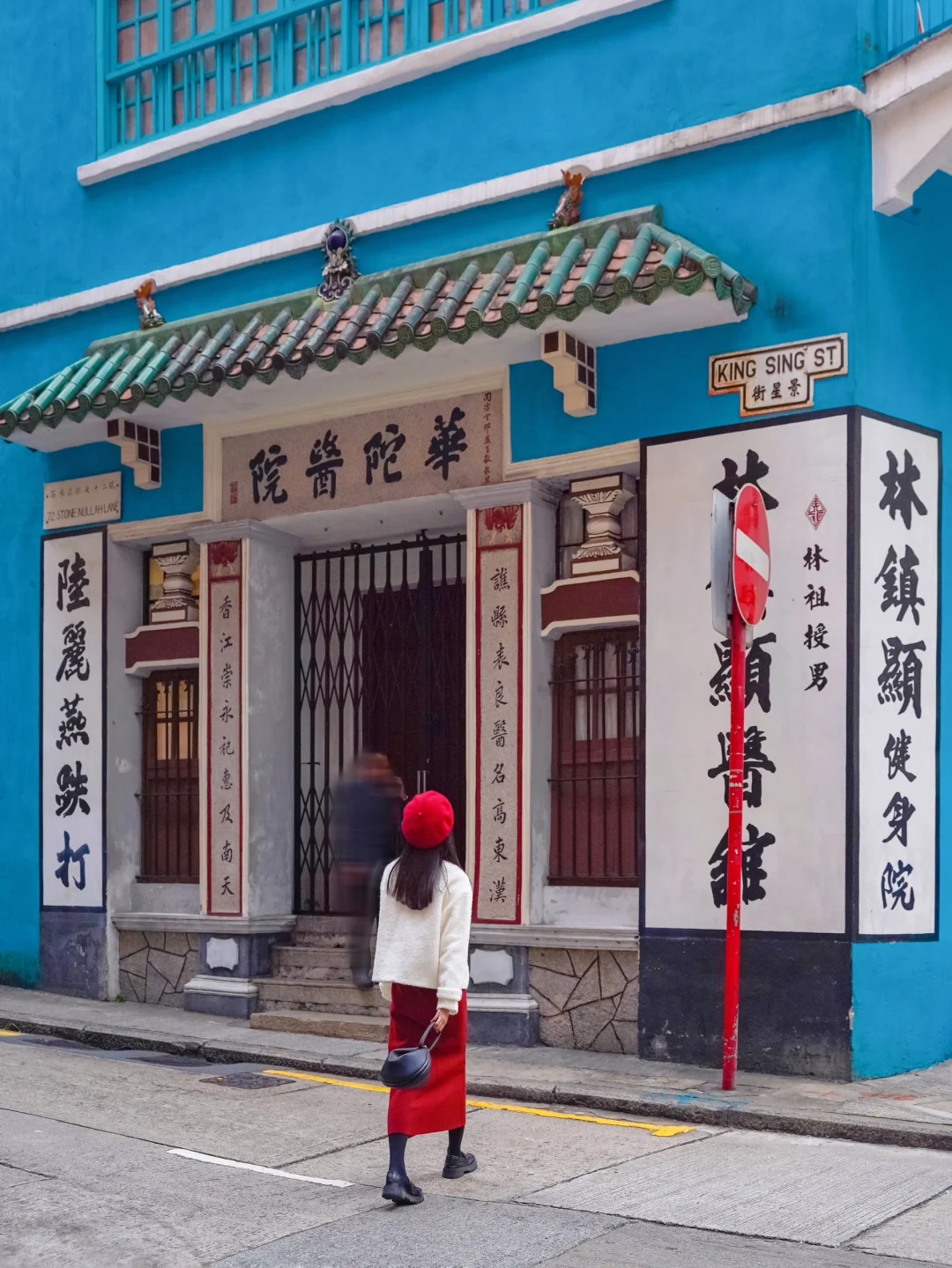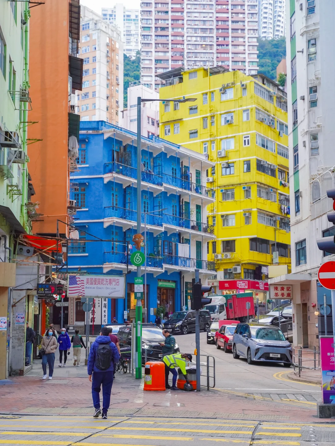 在利东街旁的皇后大道东有着不同颜色的历史建筑群,远处看过去五颜六色的街区真的充满着活力.蓝屋是香港一级历史建筑,还有橙屋、黄屋都是这里很有标志性的建筑群。