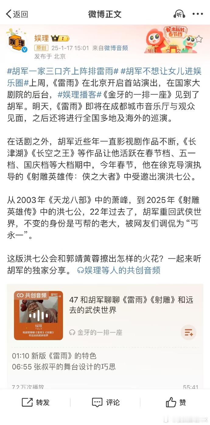 太惊喜!李六乙版话剧《雷雨》全国巡演正火热进行。胡军霸气演绎周朴园,其妻卢芳细腻诠释蘩漪,女儿九儿则在幕后担任导演助理,一家三口于话剧舞台各展风采,共同为观众带来精彩呈现 。