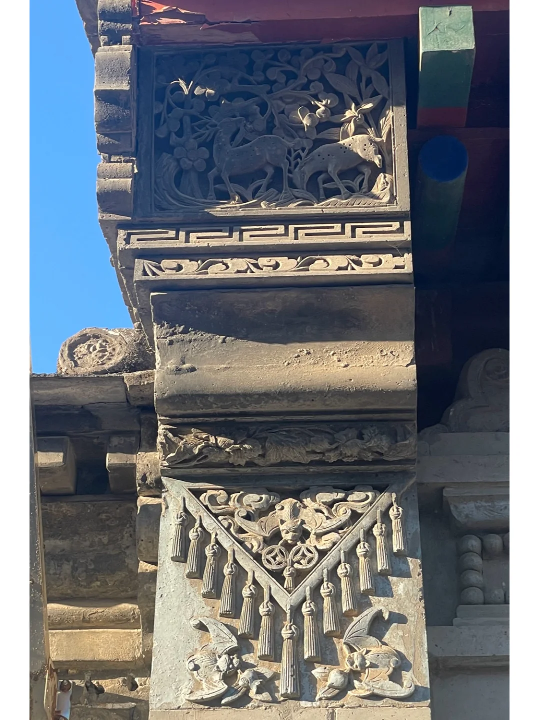 西侧是另外一个门,在粗壮的古槐的掩映下是宅院高高的门楼、硬山清水脊,戗檐砖雕梅花及两只悠闲的梅花鹿,其下雕等腰三角缀满旒苏,其内周边透雕云纹,大门刻楹联「水石澹幽居,诗书寄素业」。两边方门墩为鹿回头图案,意寓福禄。