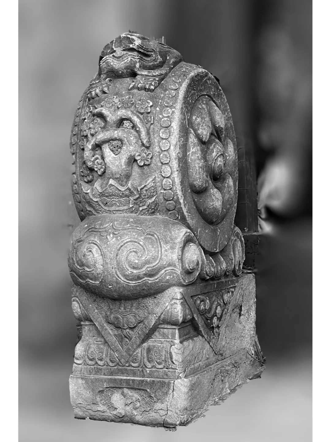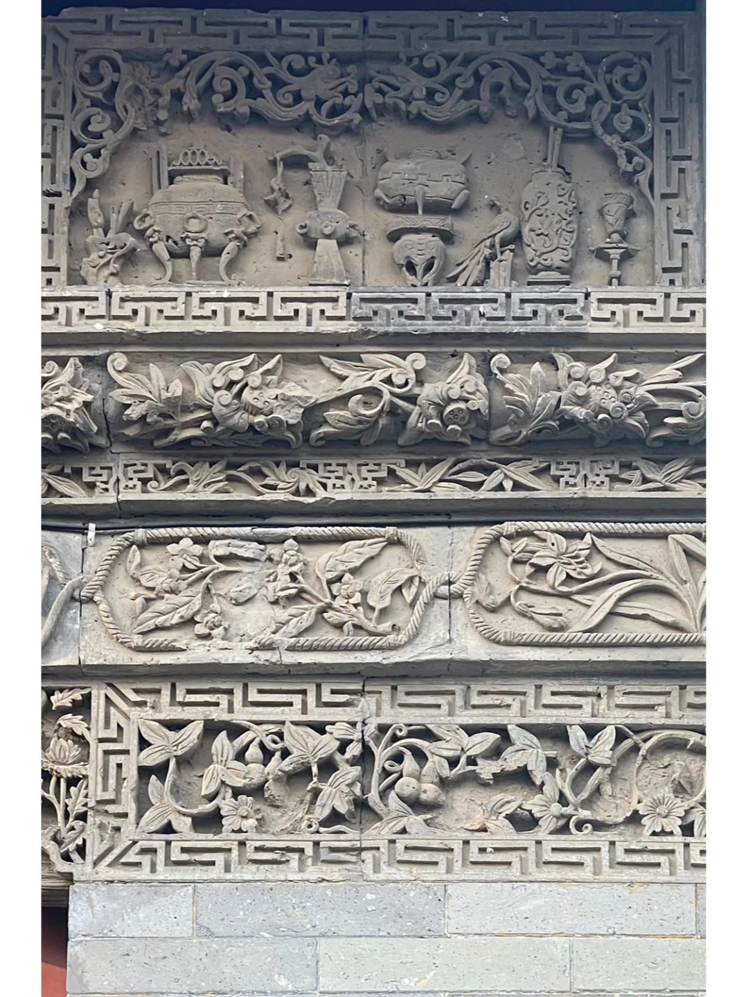 北侧北门乃雕花如意门,硬山清水脊,板瓦合瓦有勾头滴水。门楼戗檐砖下雕花篮,盛满荷花,门楣等处雕博古图及众多花卉。黑漆大门镌刻红色楹联为「春秋多佳日,瑾瑜发奇光」。门口两侧有精美的石鼓门墩,上面是一只卧着的狮子。门楣上方有精美的博古图案,象征书香门第。博古图案下面浮雕分为三层,最上一层是荷花和莲蓬连理枝,象征子子孙孙无穷尽也。中间一层是芍药花,同牡丹一样,同为富贵花。下面一层为葫芦连理枝纹,由于「葫芦」和「福禄」谐音,有健康长寿的意思,也是富贵的象征。戗檐砖下雕花篮,盛满花卉,花篮下两边的垂挂流苏。