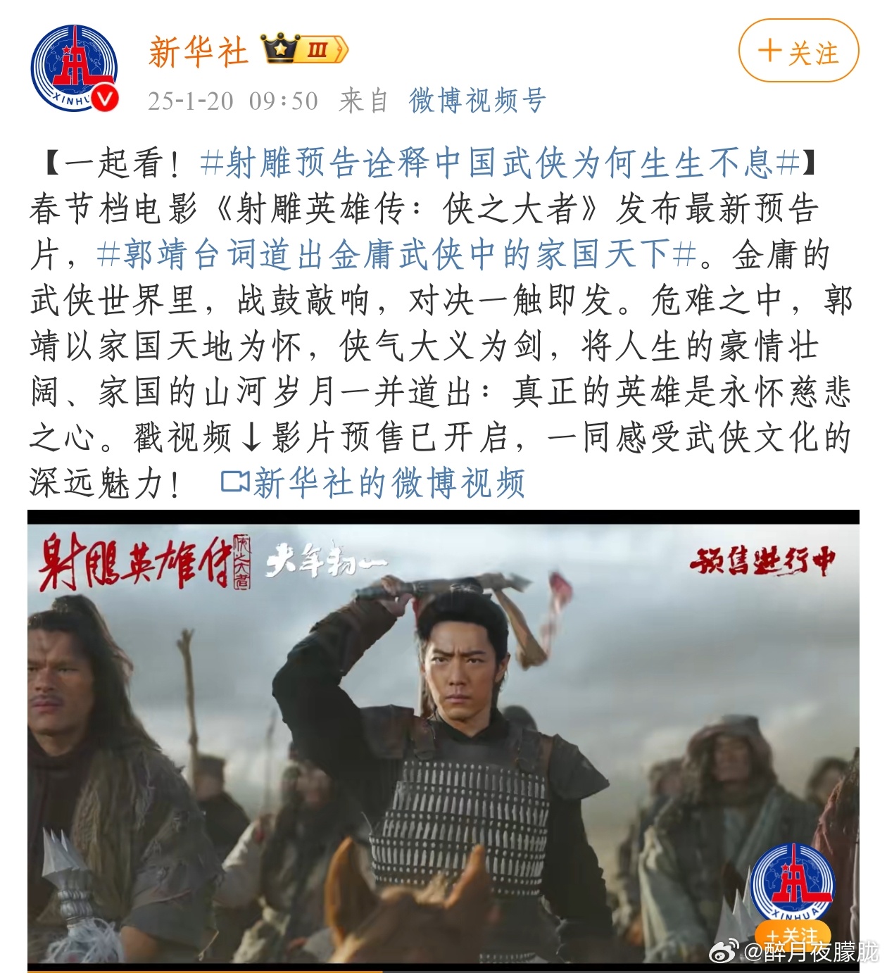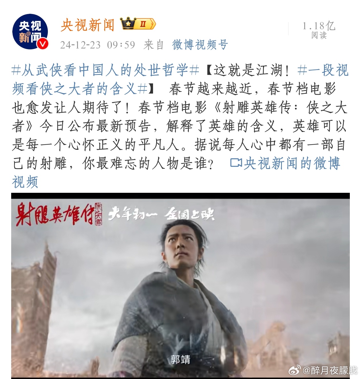 郭靖台词道出金庸武侠中的家国天下 从人民日报到央视新闻,再到新华社,《射雕英雄传侠之大者》 的意义不言而喻。纯正武侠,独属中华!大年初一江湖见!