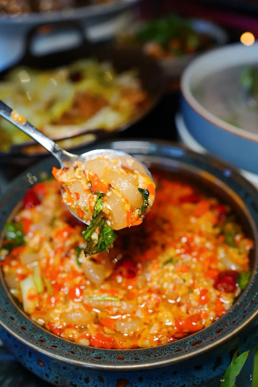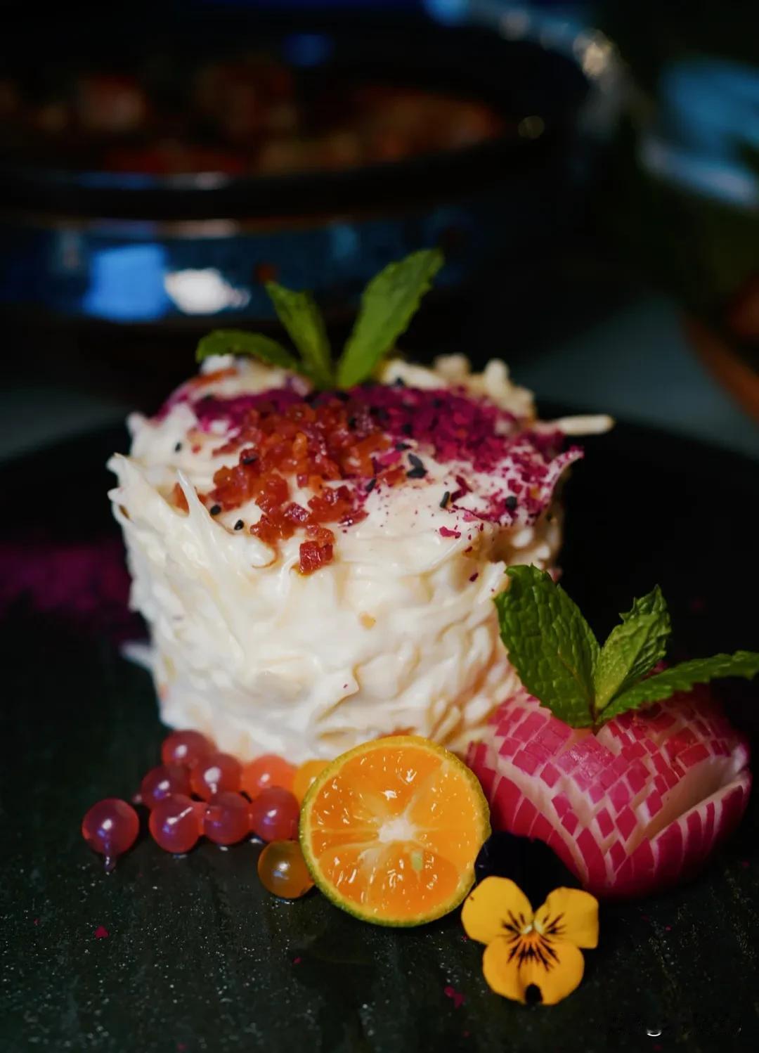 说回今天的经典十人套餐,我最喜欢的是苹果香玫瑰乳扇,作为一道精致的云南风味甜品,入口酸甜交织,浓郁的奶香在舌尖散开,令人回味无穷;云岭酸辣土著鱼,鱼肉鲜嫩,酸辣滋味完美渗透,每一口都让人直呼过瘾;还有颇具西双版纳特色风味的油炝臭牛皮,独特的口感,为舌尖带来别样体验;老昆明人都熟知的摩登粑粑,色泽金黄诱人,咬上一口,香甜的味道瞬间在口腔中弥漫开来…