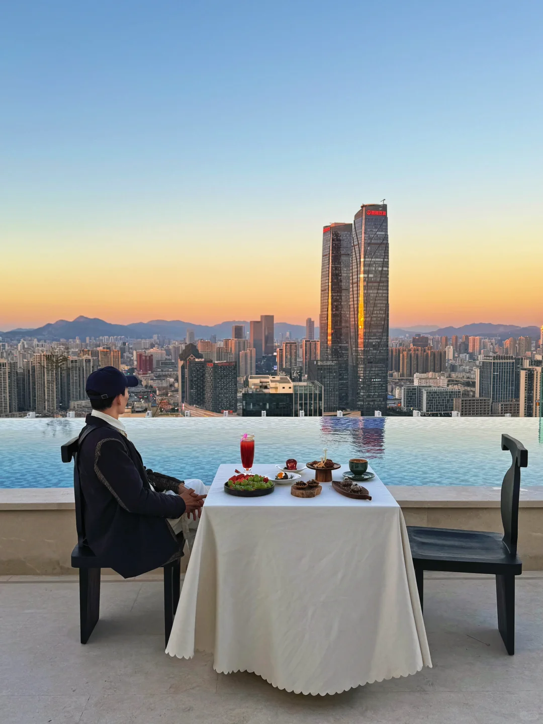 有点曼哈顿的感觉 正对面是昆明双塔 视野很棒打卡点多 随手一拍都很好看 日落时分天空橙色 蓝调时刻城市高楼 · 房间高层视野开阔 大大的落地窗设计 躺着就能欣赏霞光美景 泳池,花圃,高空咖啡 将所有美景尽收眼底 📍帕普曼酒店·万达店 ·