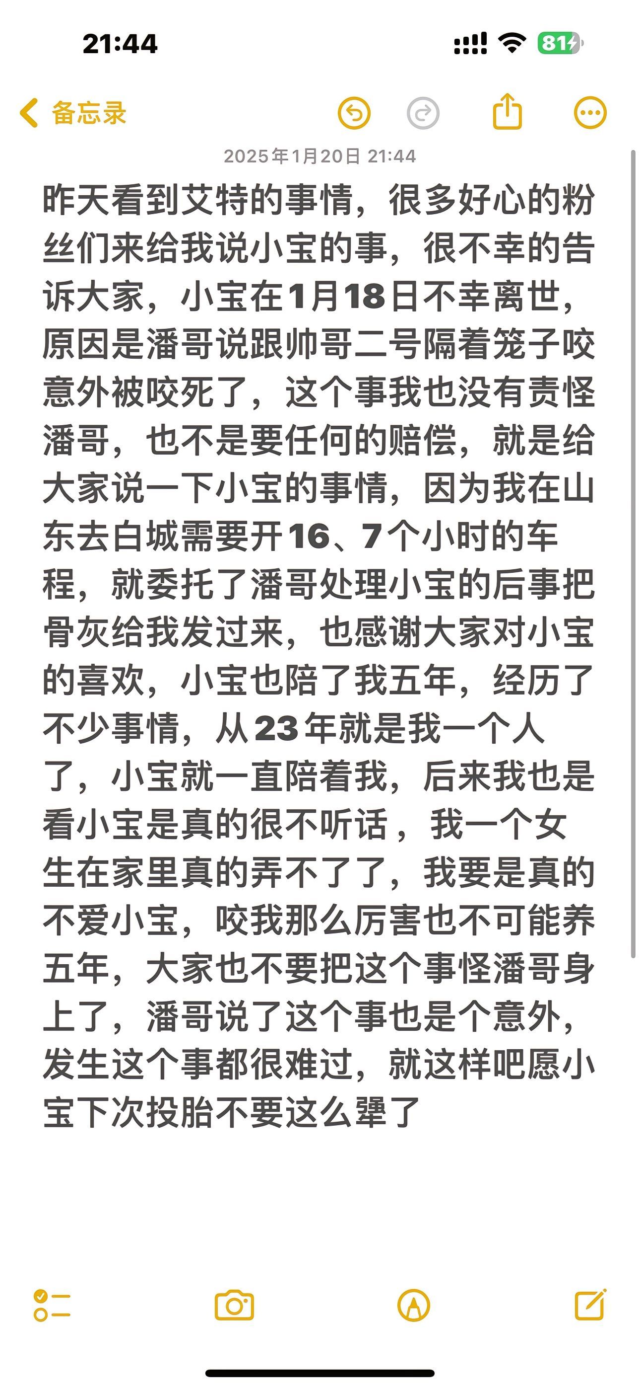 小宝主人发声,在1月18日不幸离世,原因是潘哥说跟帅哥二号隔着笼子咬意外被咬死了[苦涩]