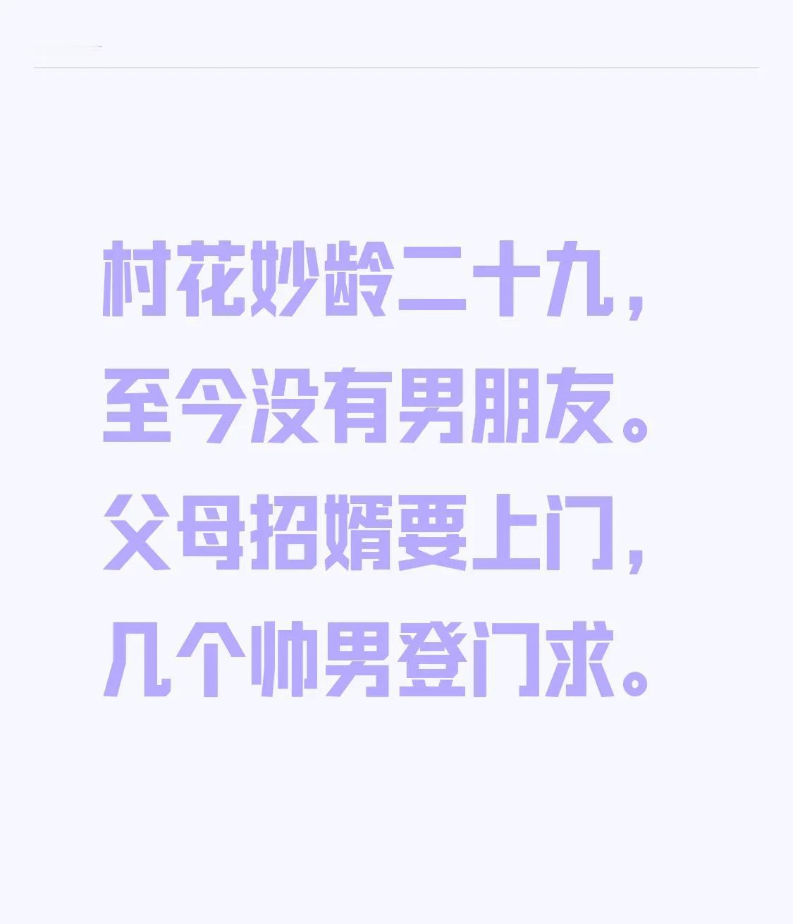 村花妙龄二十九, 至今没有男朋友。 父母招婿要上门, 几个帅男登门求。