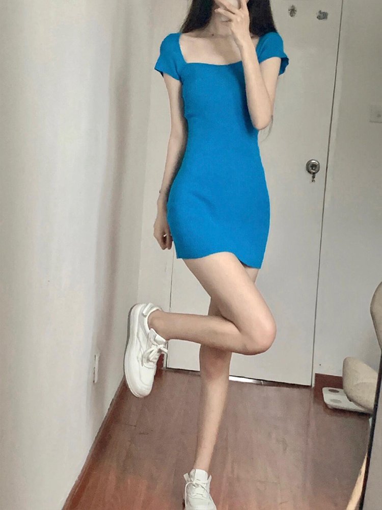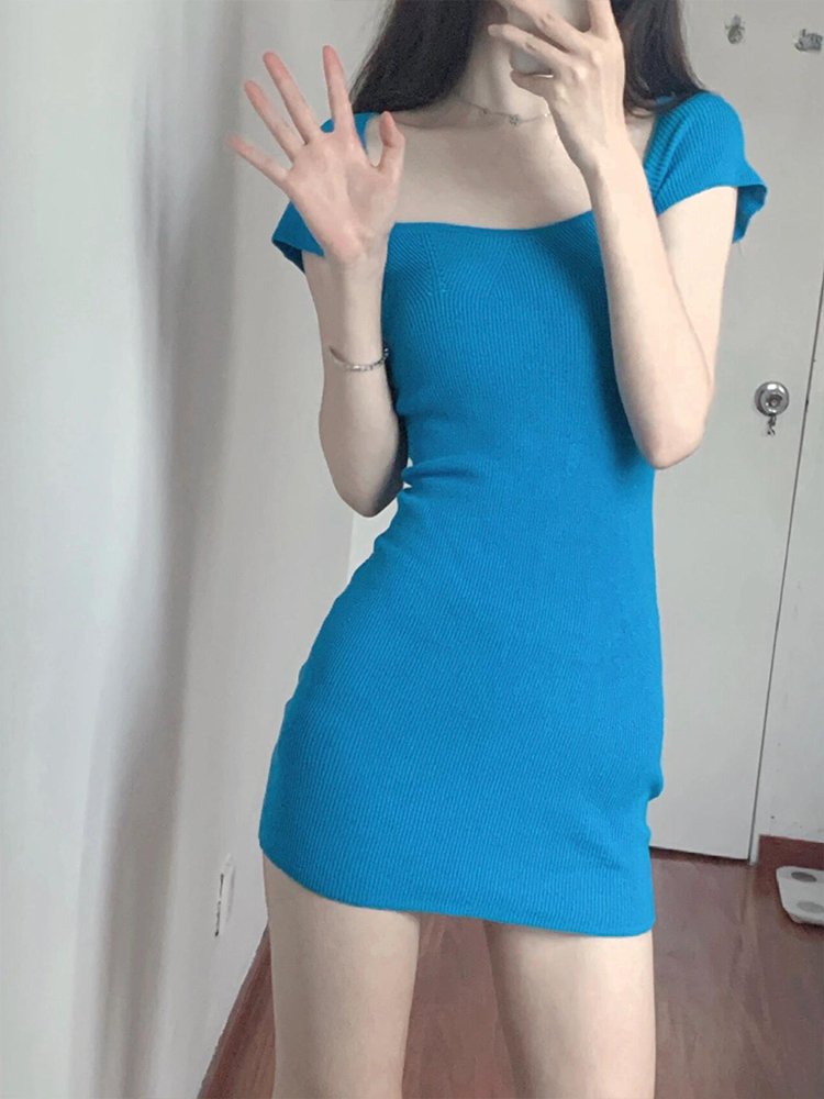 法式简约方领针织连衣裙2025年新款多巴胺绝美小裙修身显瘦包臀裙