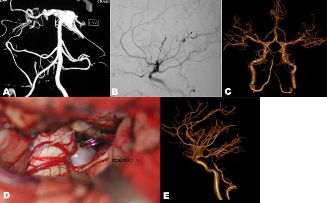 图8 A椎动脉造影显示基底动脉顶端巨大不规则动脉瘤;B血管造影侧位像见后交通动脉与大脑后动脉充分吻合;D术中照片显示动脉瘤近端基底动脉主干夹闭;C和E术后7年随访,CTA血管正侧位像显示动脉瘤消失,大脑后动脉开通好。