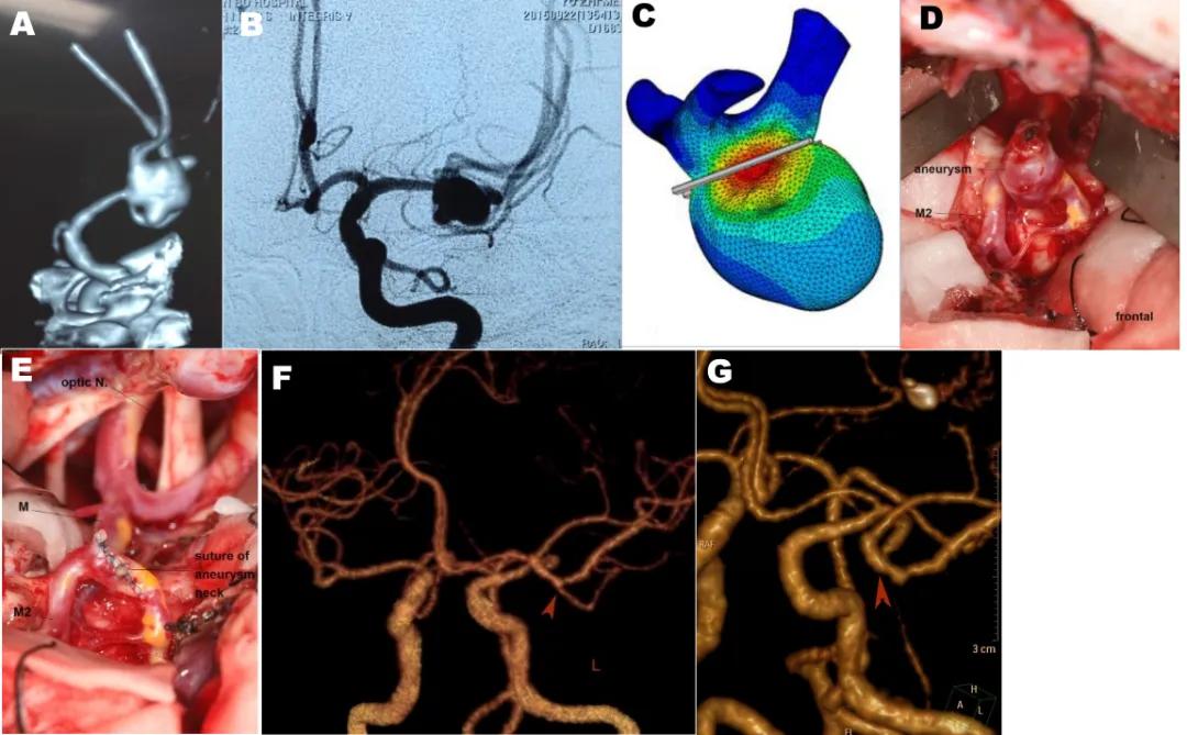 图3 A和B显示左侧大脑中动脉动脉瘤,宽颈动脉瘤颈畸形;C,术前3D模拟影像显示动脉瘤夹闭有动脉瘤夹闭不全;D,术中照片显示动脉瘤;E,术中照片动脉瘤颈缝合;F和G,术后CTA显示动脉瘤消失,颈畸形完全缝合。
