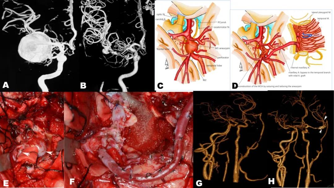 图6 A血管造影显示右侧大脑中动脉巨大动脉瘤;B动脉瘤夹闭术后一年,血管造影显示动脉瘤复发,附有多枚动脉瘤夹;C和D示意图显示颌内动脉搭桥后,切除动脉瘤壁,缝合大脑中动脉,保留其穿通动脉;E术中照片显示外侧裂内大脑中动脉瘤;F术中照片显示颌内动脉搭桥后,缝合大脑中动脉,保留其穿通动脉;G术后CTA显示颌内动脉搭桥通畅,大脑中动脉保留;H术后7年随访,血管造影显示颌内动脉搭桥通畅,大脑中动脉主干及其穿通动脉保留。