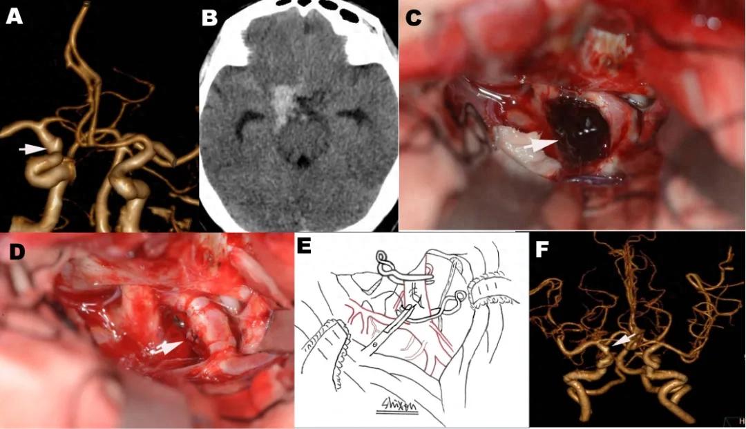 图1 A,CTA显示右侧颈内动脉前壁有一突起,即血泡样动脉瘤,箭头显示;B,CT显示右侧鞍旁出血灶;C,术中照片显示右颈内动脉出血;D,术中照片显示出血灶缝合;E,手术显示意图;F,术后CTA显示血泡动脉瘤消失。