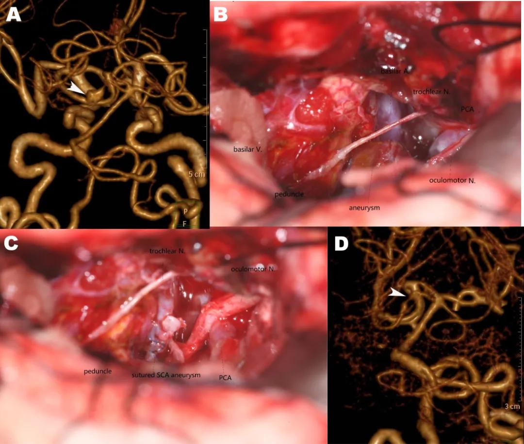图4 CTA正位像显示小脑上动脉有一破裂出血夹层动脉瘤;B,术中照片显示小脑上动脉动脉瘤陈旧性出血;C,术中照片显示动脉瘤缝合;D,术后3个月显示小脑上动脉动脉瘤消失,该动脉通畅。