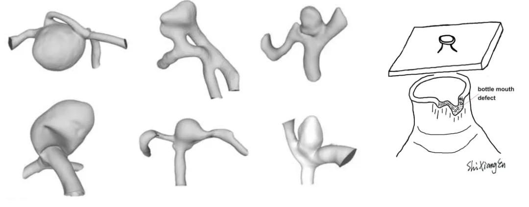 图2 图左显示动脉瘤3-D显示动脉瘤颈畸形;右图显示意瓶嘴缺损,无法盖严瓶口。