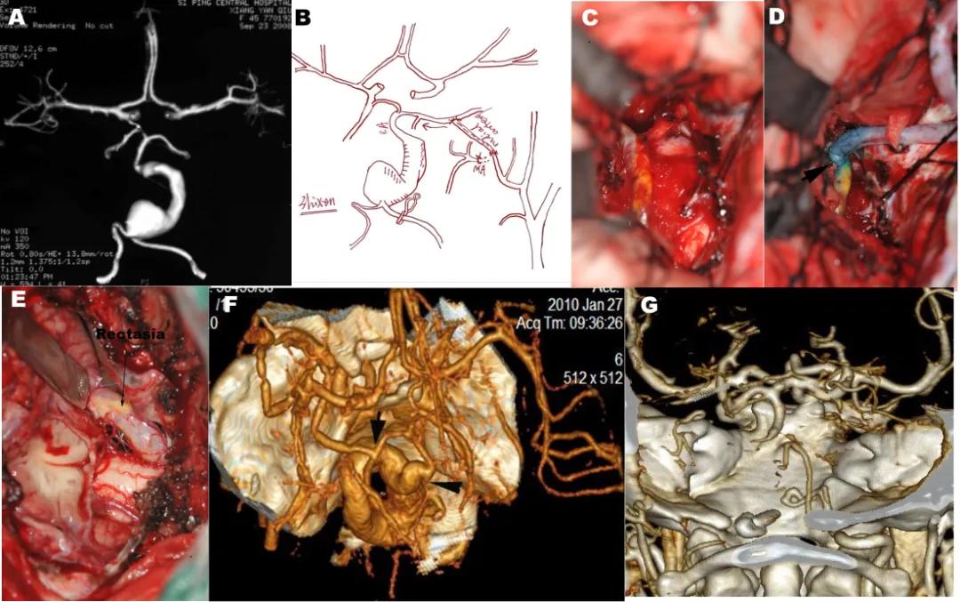 图7 A术前三维CTA显示基底动脉主干的巨肠型动脉瘤;B手术显示意图桡动脉移植,颌内动脉与大脑后动脉搭桥;C术中照片显示显露大脑后动脉;D术中照片显示桡动脉移植,颌内动脉与大脑后动脉搭桥;E术中照片显示显露椎动脉,待给予阻断;F术后三维CTA显示颌内动脉与大脑后动脉搭桥通畅,动脉瘤萎缩;G术后5年随访,显示动脉瘤消失,后循环血管重建。