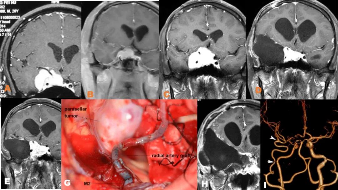 图9 26岁,男,右眼视物不清3个月,A磁共振冠状位显示右侧鞍旁肿瘤包裹颈内动脉;B第一次手术后,磁共振冠状位显示右侧鞍旁肿瘤颈内动脉外出切除,包绕颈动脉肿瘤残留;C术后4个月,再次出现头痛,视物不清,磁共振冠状位显示肿瘤再次生长,压迫视神经;D术后颞叶切除鞍内肿瘤,包绕颈内动脉,鞍内部分肿瘤未能切除。二次术后冠状磁共振显示包绕颈内动脉和鞍内肿瘤未能切除;E二次手术后8个月后,磁共振冠状位显示肿瘤再次生长,压迫视神经;G三次手术术中照片显示,桡动脉移植,颌内动脉搭桥后,鞍旁肿瘤;H三次手术后冠状磁共振显示肿瘤全切除;I术后CTA显示颌内动脉搭桥通畅,颈内动脉未显影。