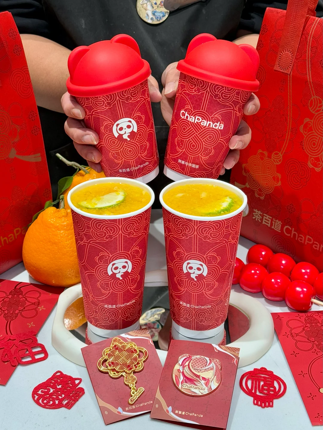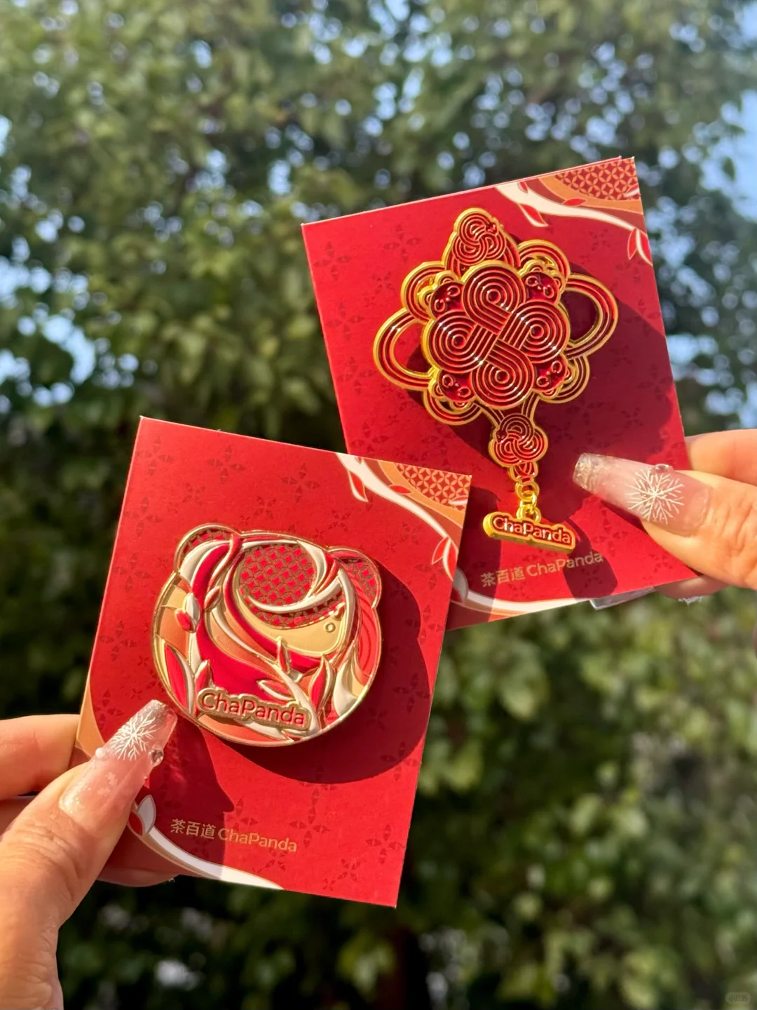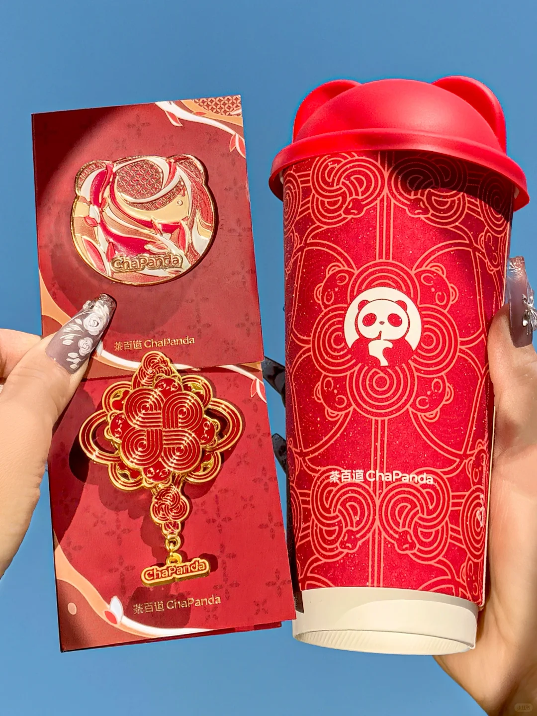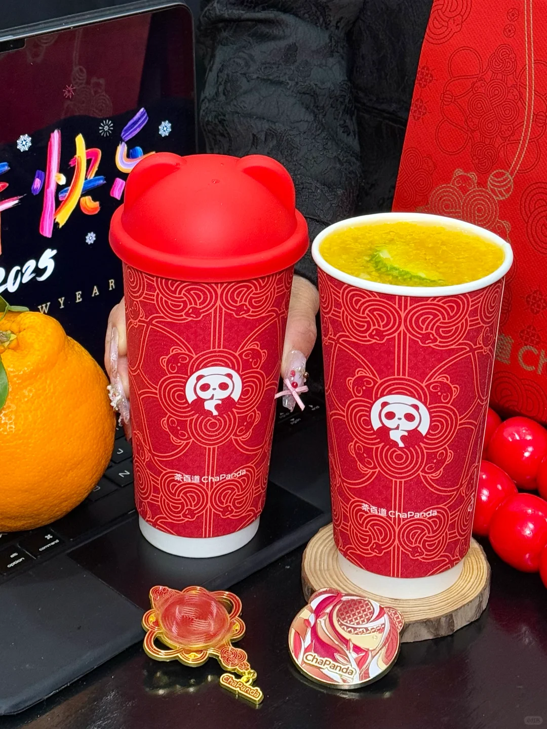 茶百道!!给我出来挨夸!! 新年徽章也太太太太好看了!!中国结还能旋转起来真的好治愈!收藏党幸福了🥹😭😭 还有新年杯和保温袋!每一个都带有中国结、铜钱纹元素好国风!!! 1.28-2.4!只要点指定双杯套餐就能get!! 👉🏻新年徽章or茶茶小耳朵!硅胶手感也贼好! 把它盖在新年杯上好好看啊!!! 加上杯身blingbling的细闪尊嘟很高级! 点了两杯还不戳的!推荐给大家!!! 🍊蜀实耙耙柑:耙耙柑果肉在嘴里跳跃!炒鸡清爽!!重点是冰的热的都好喝!过年聚会真的离不开了。。。 🍓活菌·草莓鲜奶昔:奶fufu的草莓味好好喝!!酸酸甜甜的口感ju丝滑!为什么只有中杯啊啊啊😡😡