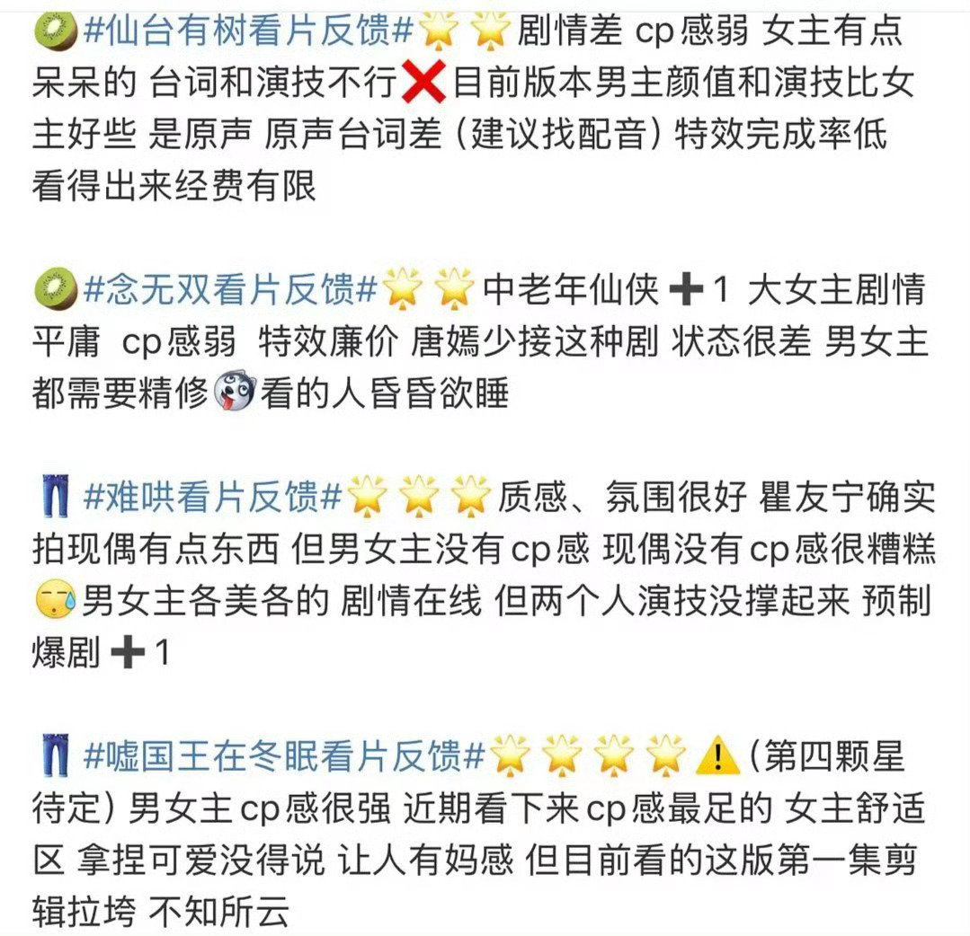 不得不说,在诸多剧里,《念无双》《仙台有树》和《青簪行》的剧本算是比较出色的。像《念无双》,我虽多次吐槽唐嫣,但剧本确实不错,《青簪行》的剧本也挺好,至少我所看部分如此,《仙台有树》的剧本同样可圈可点。然而这些剧都存在一个通病,要么是剧本不尽如人意,要么是演员表现欠佳,就没有那种各方面都令人满意的,看样子接下来怕是要进入一个连扑的阶段了。