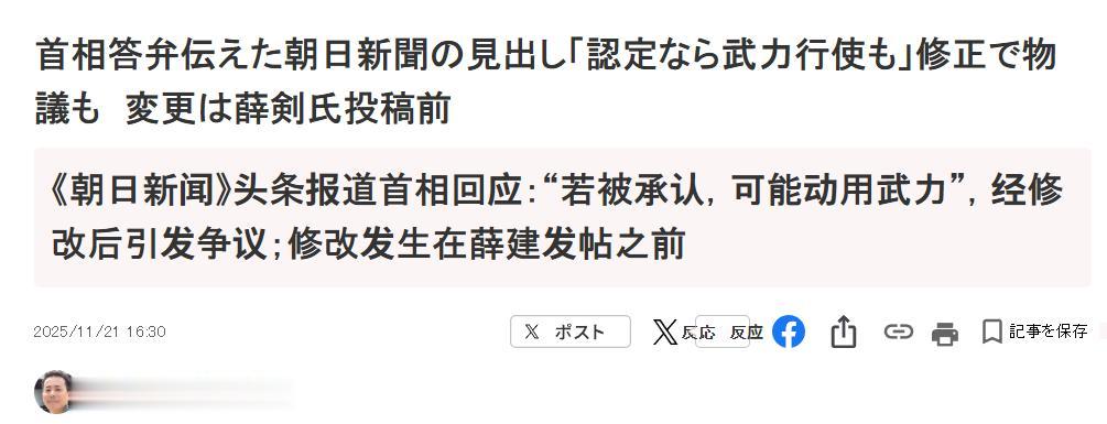 而回顾整件事,在高市早苗作出错误涉台言论以后,第一个舆论高潮其实发生在薛剑领事转发了日媒《朝日新闻》的相关报道,并配文“对于擅自伸过来的那个肮脏的脑袋,唯有毫不犹豫地砍掉。”然而,对于这件事,日本也开始“反思”上了。
