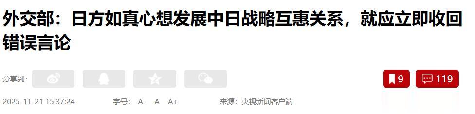 因为自事件发生以来十几天了,中方不止一次的敦促日本认错、道歉和撤回言论。这绝不是一句标题有问题,就能将此事蒙混过关。相反,造成当前局势的根本原因,全都在日本,尤其是高市早苗身上。而值得注意的是,即将离开日本外出参会的高市早苗,一连表态2件事不会变。