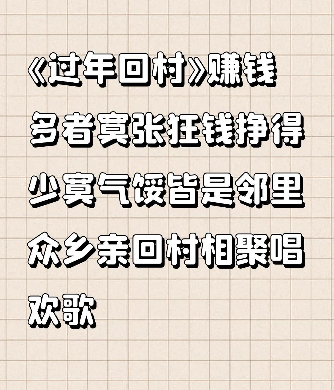 《过年回村》 赚钱多者寞张狂 钱挣得少寞气馁 皆是邻里众乡亲 回村相聚唱欢歌