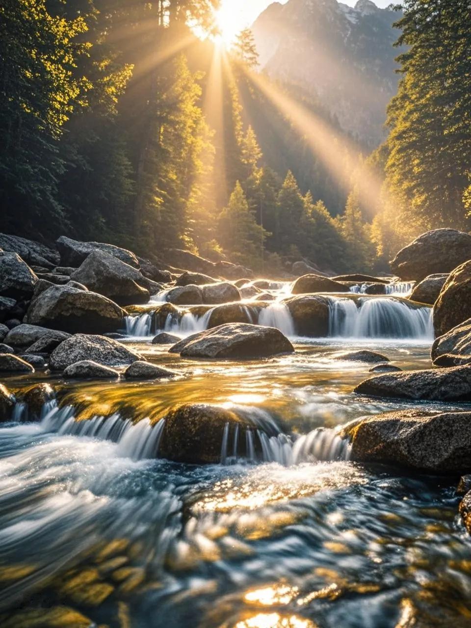 清泉灵动妻悠闲, 真心陪伴静无言。 柔风徐来水波荡, 霞光映溪鱼儿欢。