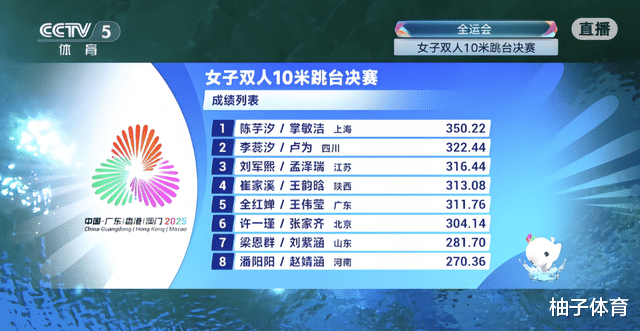 2025年11月6日晚,广东奥林匹克体育中心游泳跳水馆内,女子双人10米台决赛落下帷幕。陈芋汐与掌敏洁组合以350.22分的成绩强势夺金,全红婵与王伟莹则以311.76分位居第五。