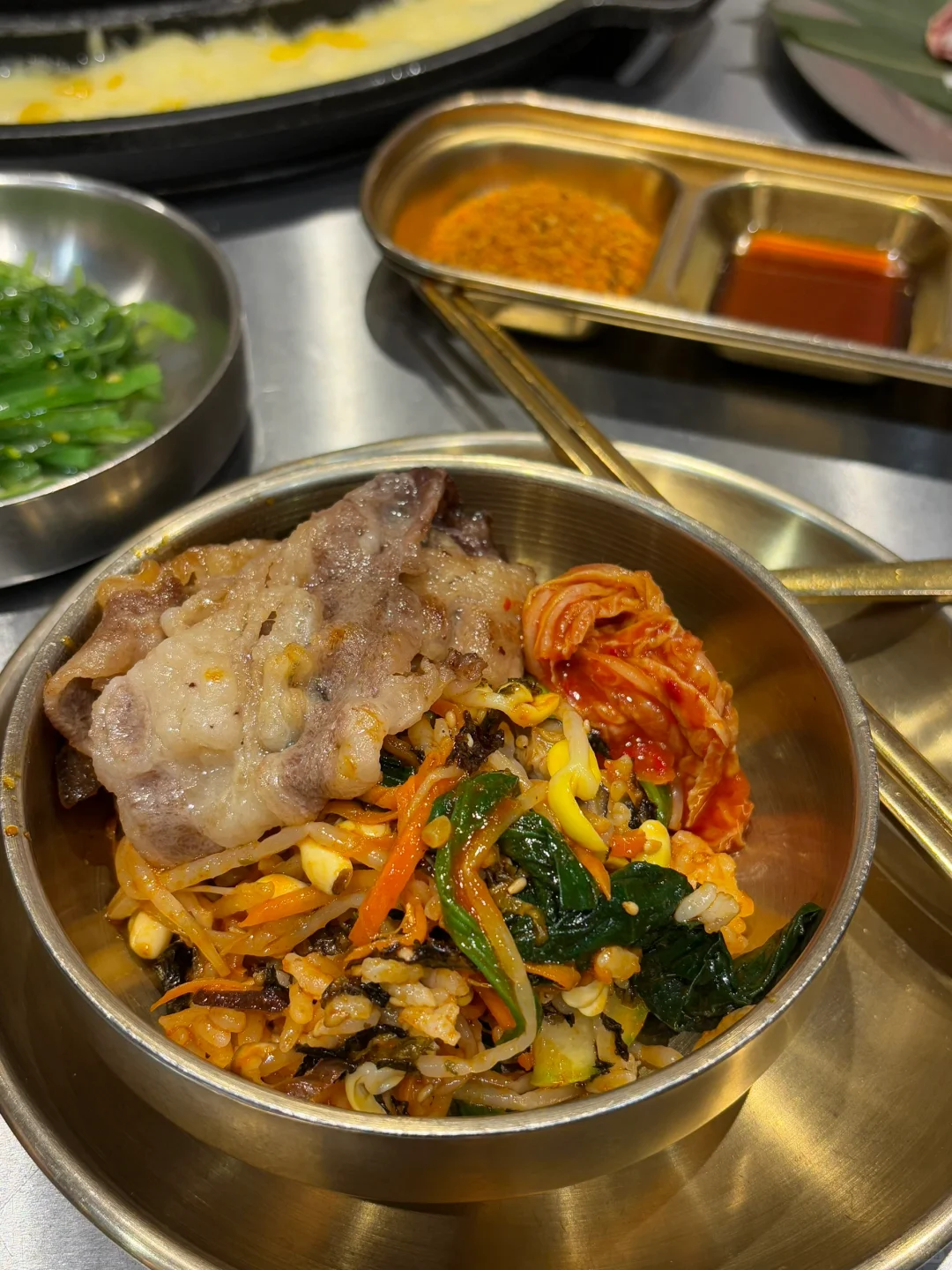 跟好久没见的姐妹吃饭 这家烤肉店好韩好好吃!装修很还原韩剧街头 颜色鲜艳好出片🧸肉质也不错 味道也好吃!而且还很平价!快冲! 📍 恩泽家韩国烤肉 - 果味坛子牛肉:58r 肉片厚度刚好 肥瘦适中 腌制的味道很浓郁 有一点点果子的微甜🍍底部还有菠萝块 烤着很好吃! - 黑猪横膈膜:42r 好吃!腌制入味 葱香味很浓 肉烤出来会报纸爆汁💦 - 原味牛五花:49r 滋啦冒油!可以烤的微微焦 配上拌饭 或者卷到生菜里 简直太美味! - 全州拌饭:28r 微微辣 蛮不错的!